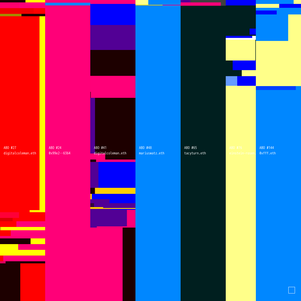 ABO #27 is connected to ABO #24 (owned by 0x99e2e69F98b164c399Cc12D8382a82135EeA6364), ABO #41 (owned by digitalcoleman.eth), ABO #48 (owned by mariuswatz.eth), ABO #65 (owned by tacyturn.eth), ABO #76 (owned by einstein-rosen.eth) and ABO #144 (owned by 0xfff.eth).