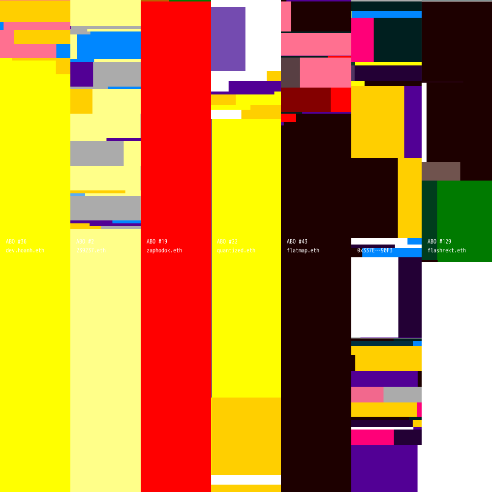 ABO #36 is connected to ABO #2 (owned by 239237.eth), ABO #19 (owned by zaphodok.eth), ABO #22 (owned by quantized.eth), ABO #43 (owned by flatmap.eth), ABO #95 (owned by 0x337E215605e308e46ad0D834DAe6C33Fdcff90F3) and ABO #129 (owned by flashrekt.eth).