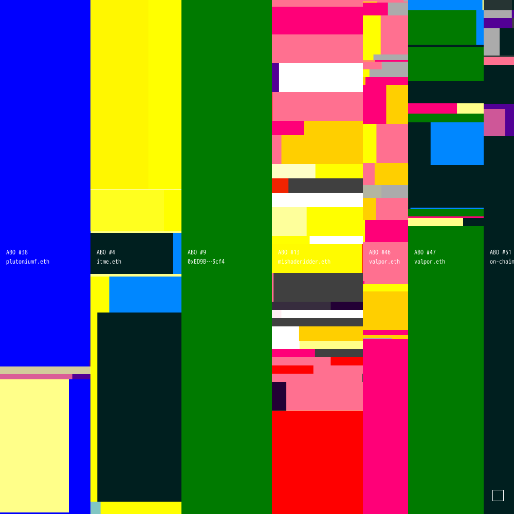 ABO #38 is connected to ABO #4 (owned by itme.eth), ABO #9 (owned by 0xED9B05d2Ff1a3c2Fe2922737D09f520363983cf4), ABO #13 (owned by mishaderidder.eth), ABO #46 (owned by valpor.eth), ABO #47 (owned by valpor.eth) and ABO #51 (owned by on-chain-culture.eth).