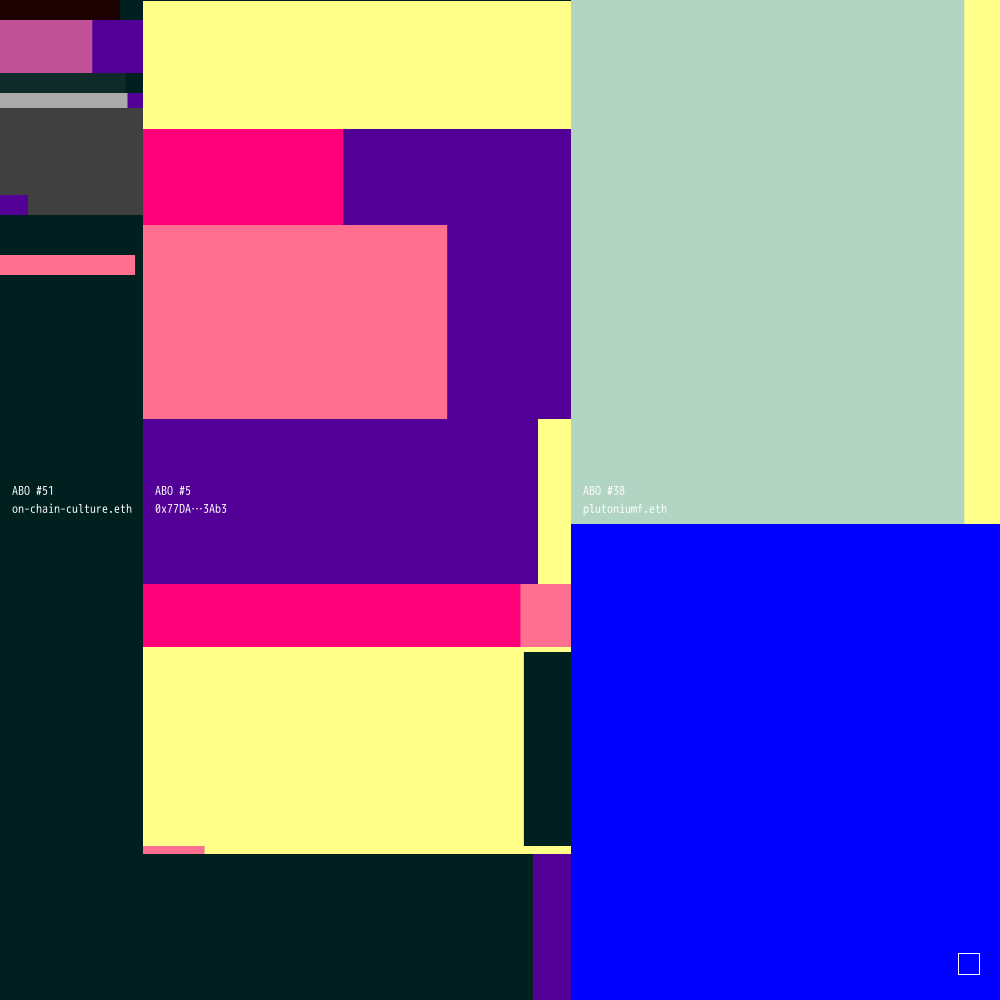 ABO #51 is connected to ABO #5 (owned by 0x77DA0BD38461d28eE1299dbA1343288Cbe113Ab3) and ABO #38 (owned by plutoniumf.eth).