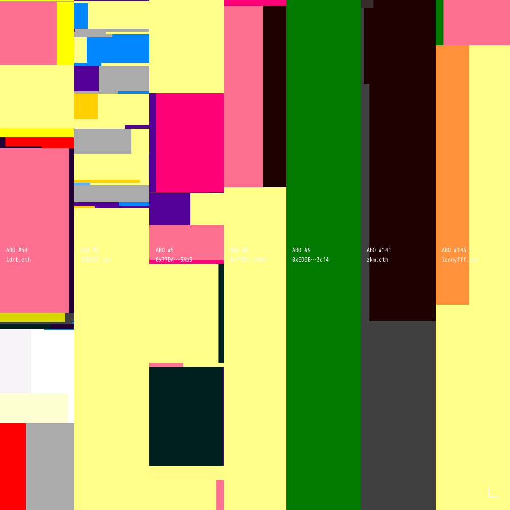 ABO #54 is connected to ABO #2 (owned by 239237.eth), ABO #5 (owned by 0x77DA0BD38461d28eE1299dbA1343288Cbe113Ab3), ABO #8 (owned by 0x77DA0BD38461d28eE1299dbA1343288Cbe113Ab3), ABO #9 (owned by 0xED9B05d2Ff1a3c2Fe2922737D09f520363983cf4), ABO #141 (owned by zkm.eth) and ABO #146 (owned by lennyfff.eth).