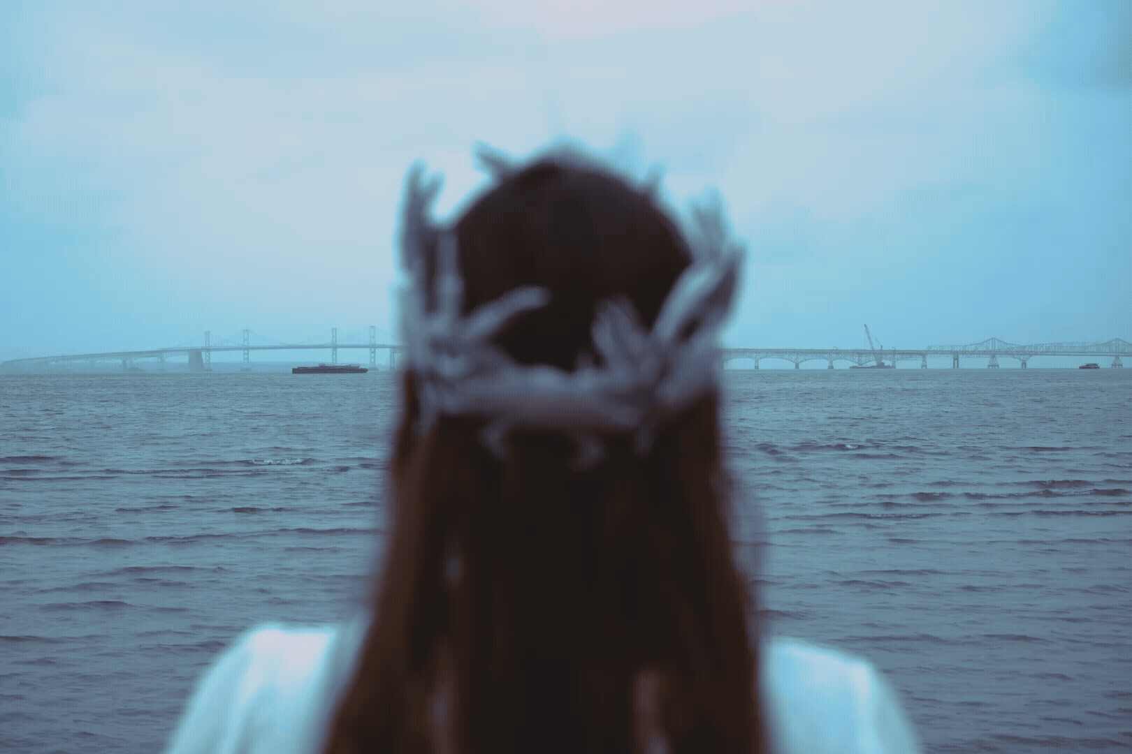 Months later I was standing on the edge of the Chesapeake Bay with a bespoke crown of crabs on my head. It was raining. The sand was completely wet. I looked out into the distance and saw the Bay Bridge. Holding still, we got the shot. I thought about how many crabs were out there right then, feasting on the stirred up ground from the rain.