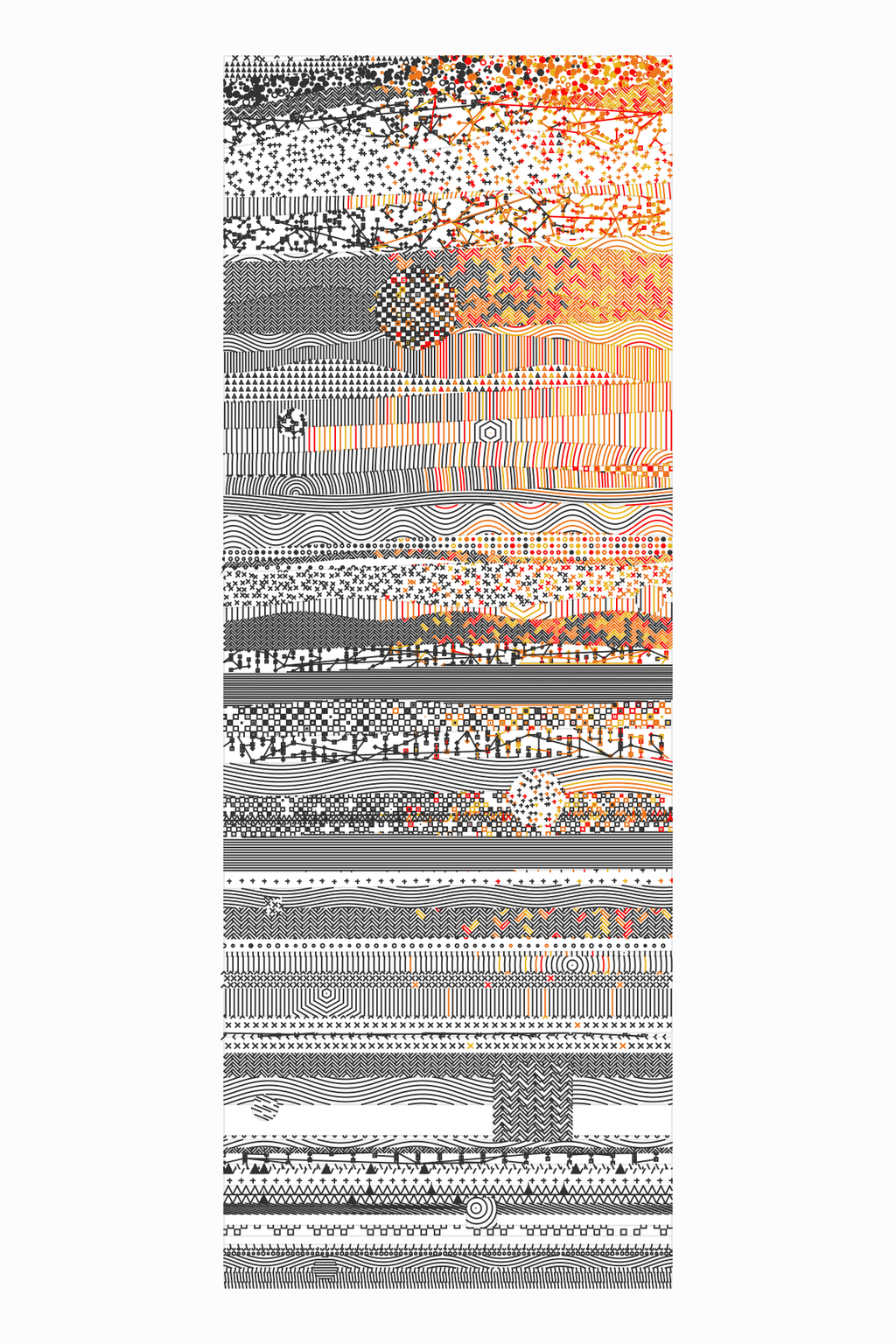 James Merrill’s “Chaos Blocks” drawings explore the tension between order and chaos. Each drawing in the series is reminiscent of a geological drawing, and we see them created on the screen as each layer draws on top of the next. After the layers are created, each is filled with an unexpected, vibrant pattern. James is reacting against the inhuman perfection that often characterizes visual art created through machines. With this focus, his work has a strong relationship to many of the first plotter drawings created in the 1960s that explored randomness to circumvent precision. James amplifies this further with his library of dense and meticulous patterns.