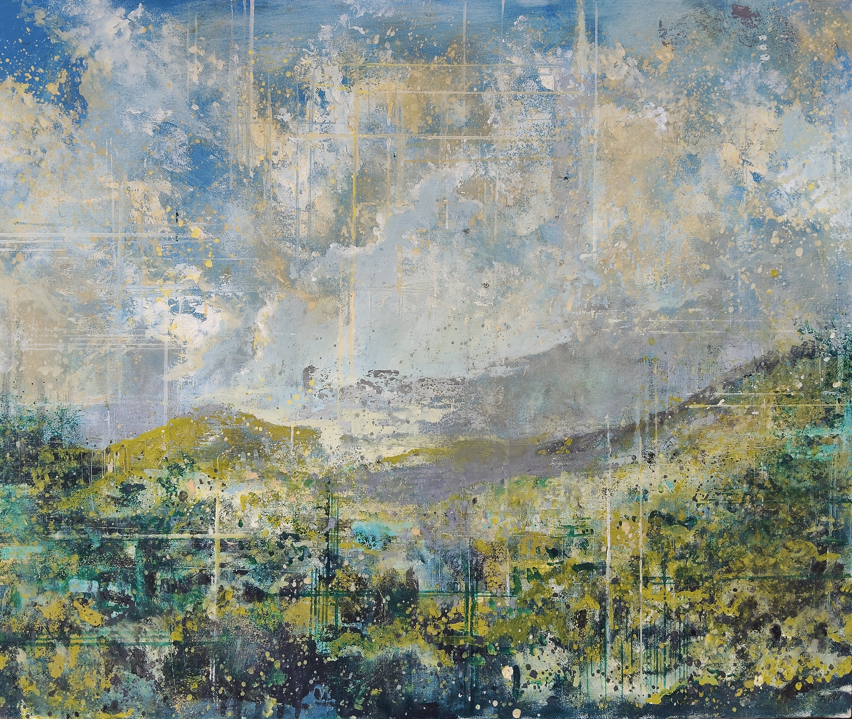 Oil painting hand-painted by the artist after a generative process using hundreds of AI-generated landscapes. These images were processed through a custom computer vision algorithm designed by the artist to segment, recompose, and create a new synthetic landscape. The title of this work was generated by an AI model, adding a meta layer that connects the algorithmic process to the final interpretation.