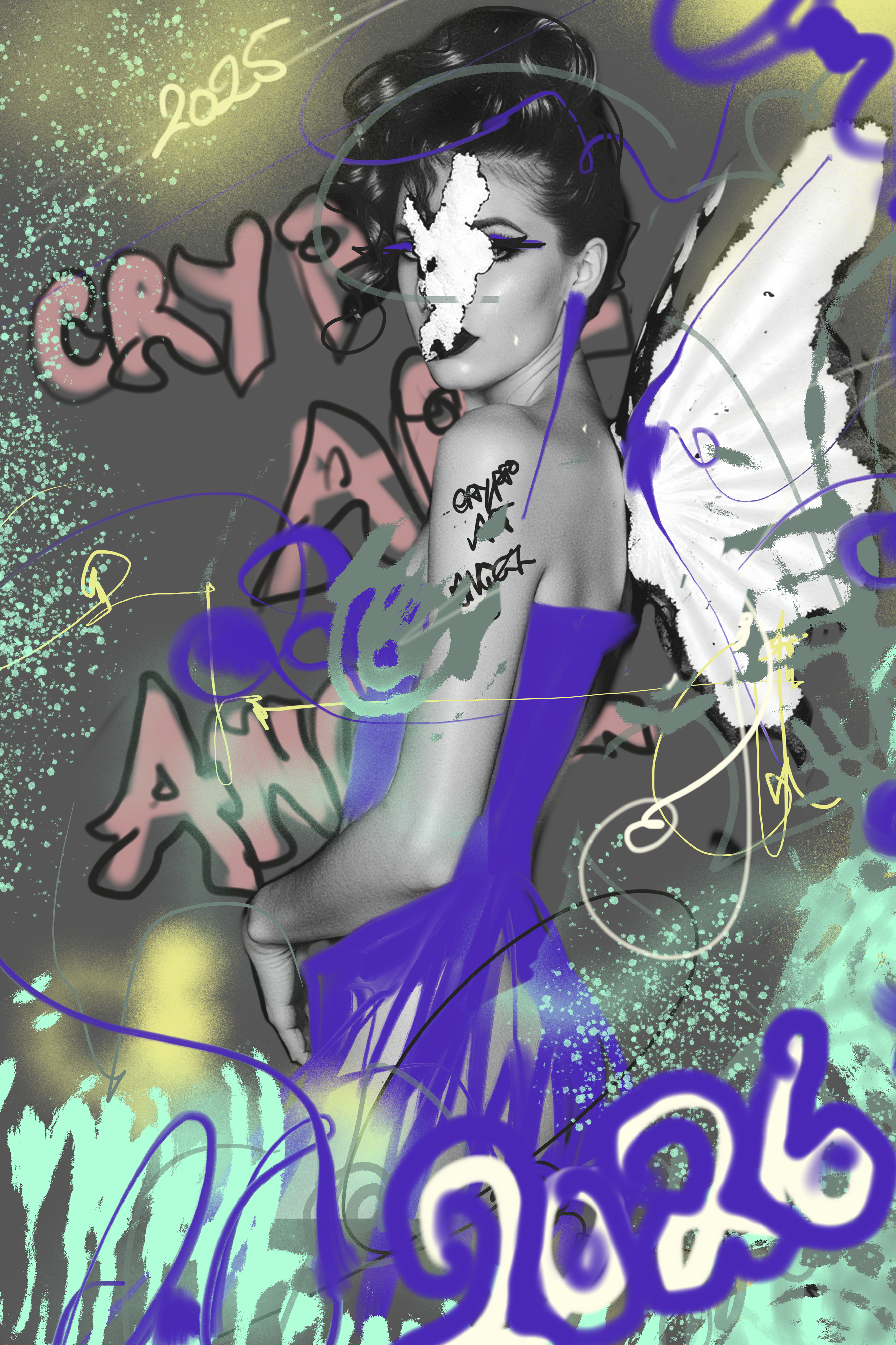 Custodia stands in guarded stillness. An angel of holding, marked by restraint rather than release. Graffiti scars, sealed wings, value kept close to the body. She does not chase cycles. She protects what endures.