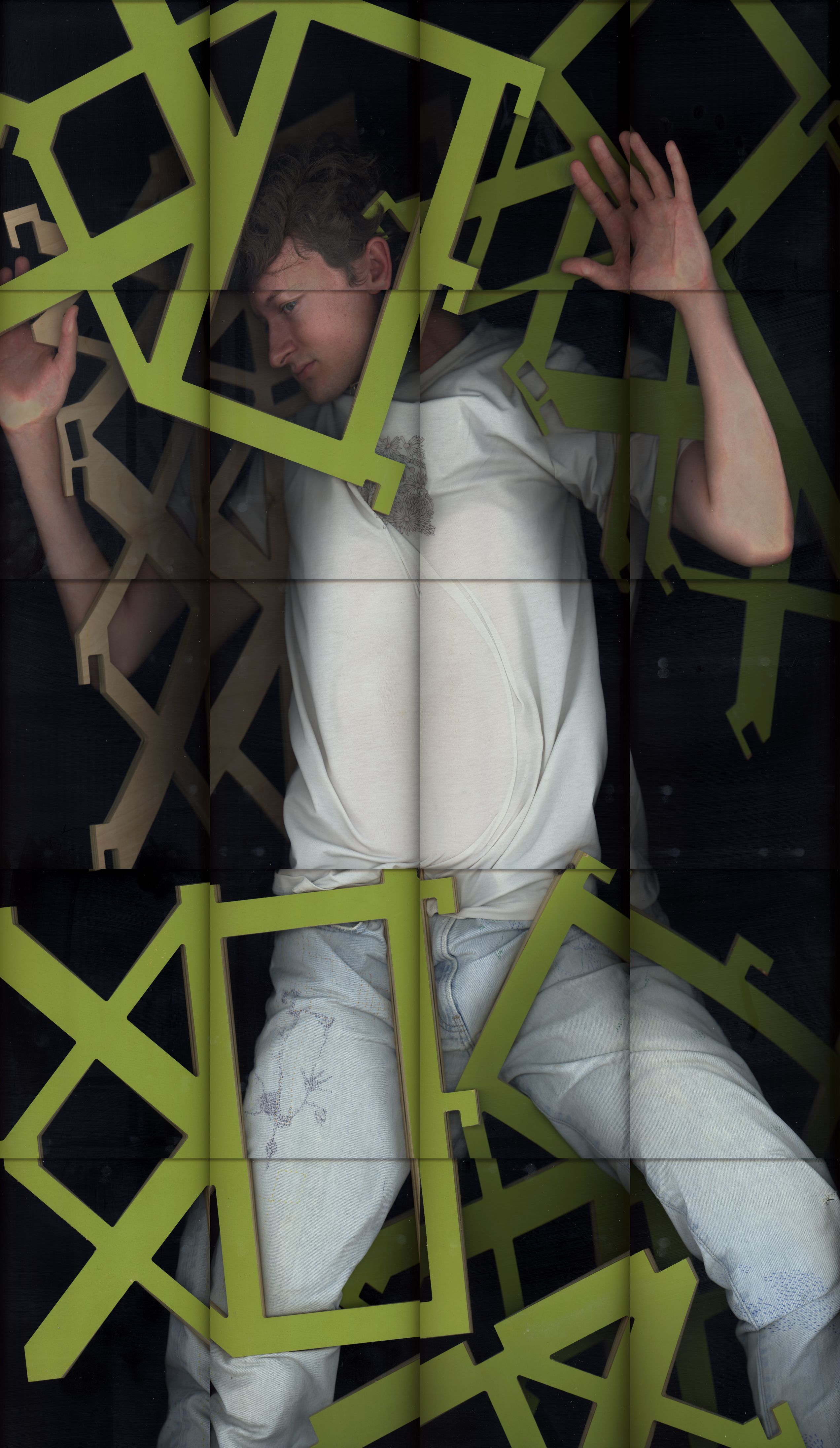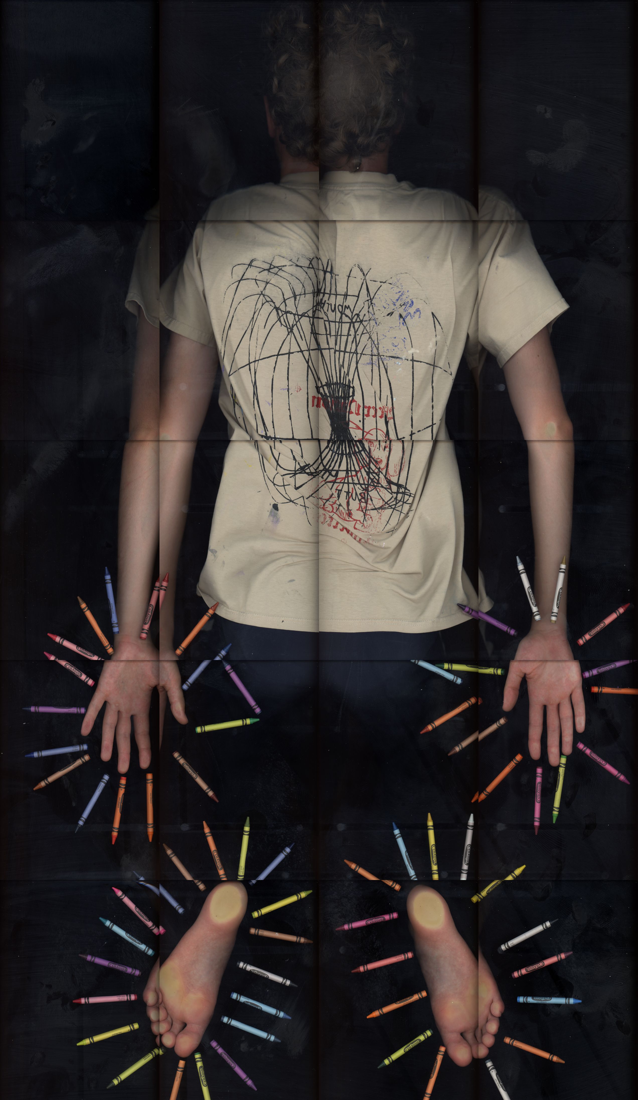 The plotter-scanner is a tool of simultaneous surveillance and witness. While the scanner suggests a clinical and impersonal perspective, the act of making images requires total closeness. The resulting prints are both precise and intimate, holding the body at scale, yet fractured at the seams. Shannon likens this to being online: an expansive presence stretched across windows and gridded feeds, pieced together from fragmentary, constantly updating views. Shannon’s engagement with the machine becomes a new form of self-portraiture: durational, ephemeral, and mirroring the artist’s own presence.