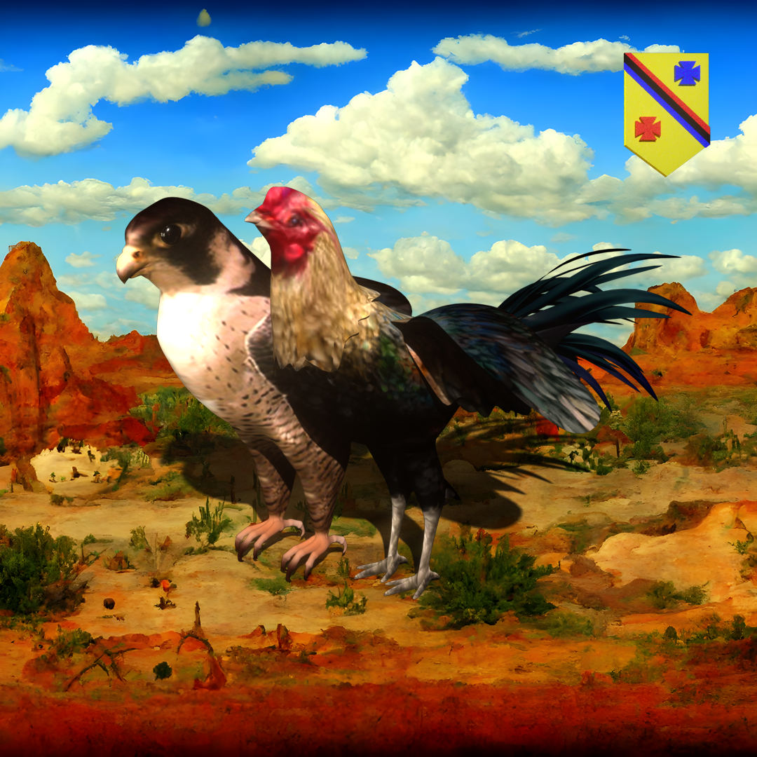 #408 | Falcon and Rooster scene with background seed 972 and a Shield (Swiss-German) card suit by FELT Zine | Verse
