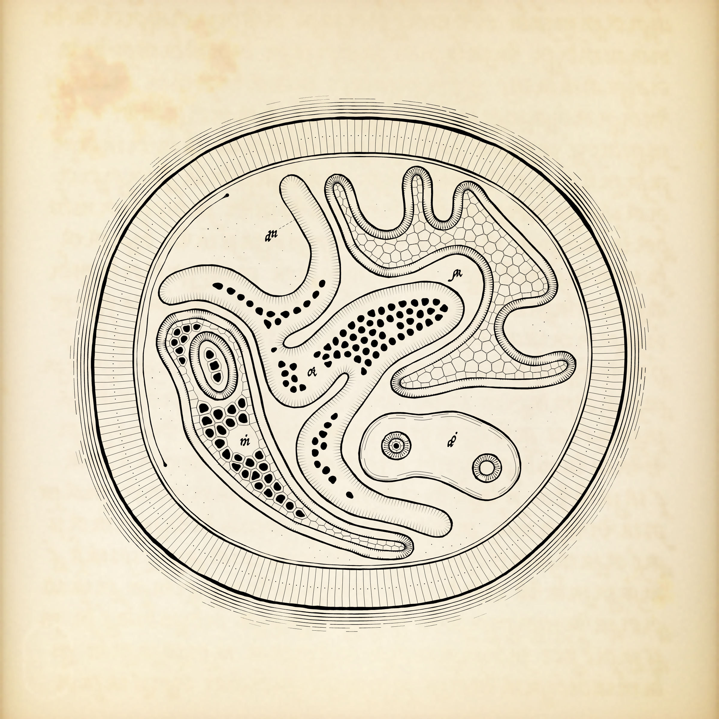 The Cytographia project draws inspiration from several historically significant books that visually and methodically documented encounters with the unknown. These include Robert Hooke's Micrographia (1665), a landmark of scientific observation in which living cells were described for the first time; Edmund Fry's Pantographia (1799), an attempt to compile exemplars of all the world's writing systems; Ernst Haeckel's Kunstformen der Natur (1899), a rich exploration of symmetry and structural hierarchy in natural forms; and Luigi Serafini's hallucinatory Codex Seraphinianus (1981), a visual encyclopedia of an artist's imagined world. The generative letterforms in Cytographia are loosely based on 16th-century typefaces by Ludovico degli Arrighi.