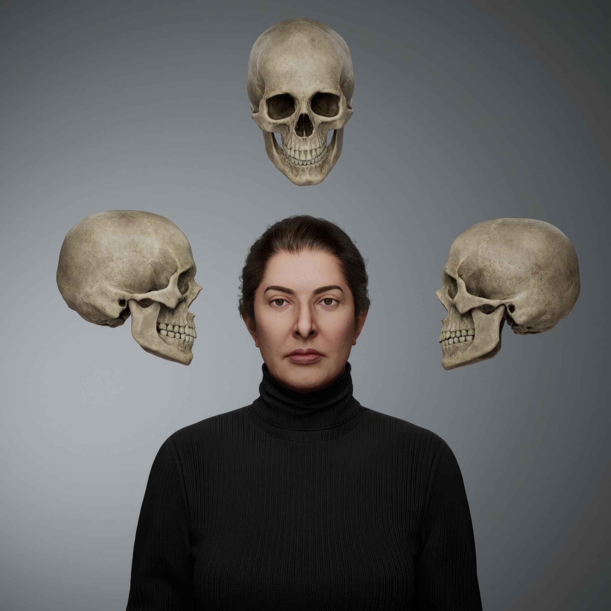 From the outset, Marina Abramović's practice has pushed the limits of experimental art, with actions that function as purification rituals in her quest for an absolute freedom. This work belongs to the broader series titled The Balkans and is deeply intertwined with her performance Nude with Skeleton. The piece draws inspiration from an ancient Tibetan tradition, where monks meditate on impermanence by sleeping in cemeteries alongside decaying corpses. In Self-Portrait with Skeleton, Abramović confronts the inevitability of her own death, using the skeletal form as both a companion and a mirror.