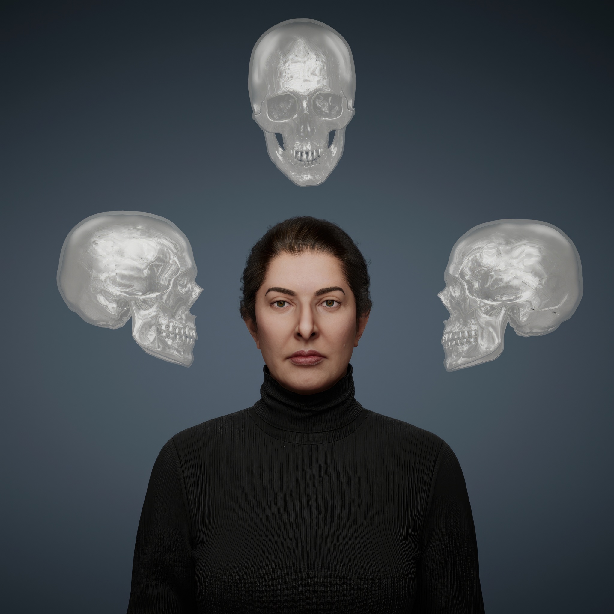From the outset, Marina Abramović's practice has pushed the limits of experimental art, with actions that function as purification rituals in her quest for an absolute freedom. This work belongs to the broader series titled The Balkans and is deeply intertwined with her performance Nude with Skeleton. The piece draws inspiration from an ancient Tibetan tradition, where monks meditate on impermanence by sleeping in cemeteries alongside decaying corpses. In Self-Portrait with Skeleton, Abramović confronts the inevitability of her own death, using the skeletal form as both a companion and a mirror.