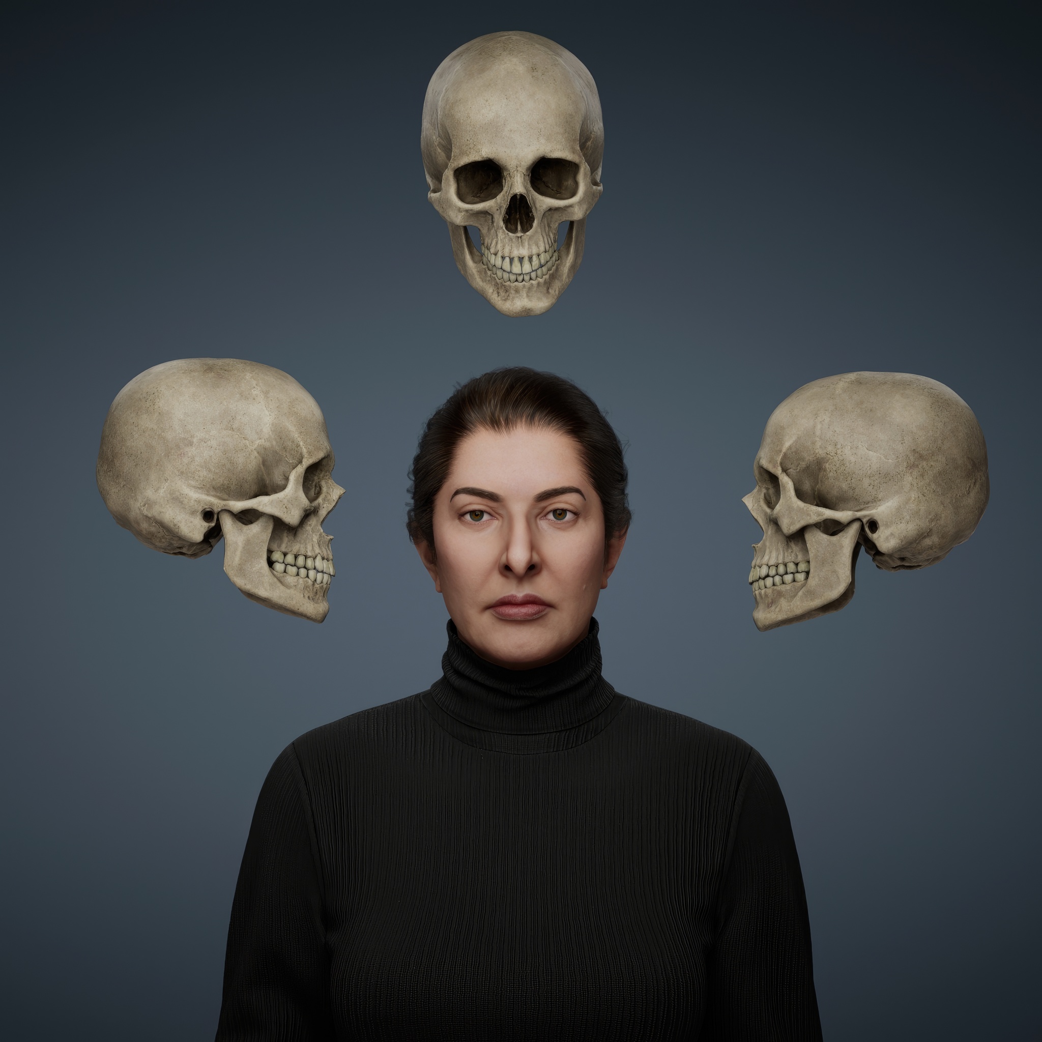 From the outset, Marina Abramović's practice has pushed the limits of experimental art, with actions that function as purification rituals in her quest for an absolute freedom. This work belongs to the broader series titled The Balkans and is deeply intertwined with her performance Nude with Skeleton. The piece draws inspiration from an ancient Tibetan tradition, where monks meditate on impermanence by sleeping in cemeteries alongside decaying corpses. In Self-Portrait with Skeleton, Abramović confronts the inevitability of her own death, using the skeletal form as both a companion and a mirror.