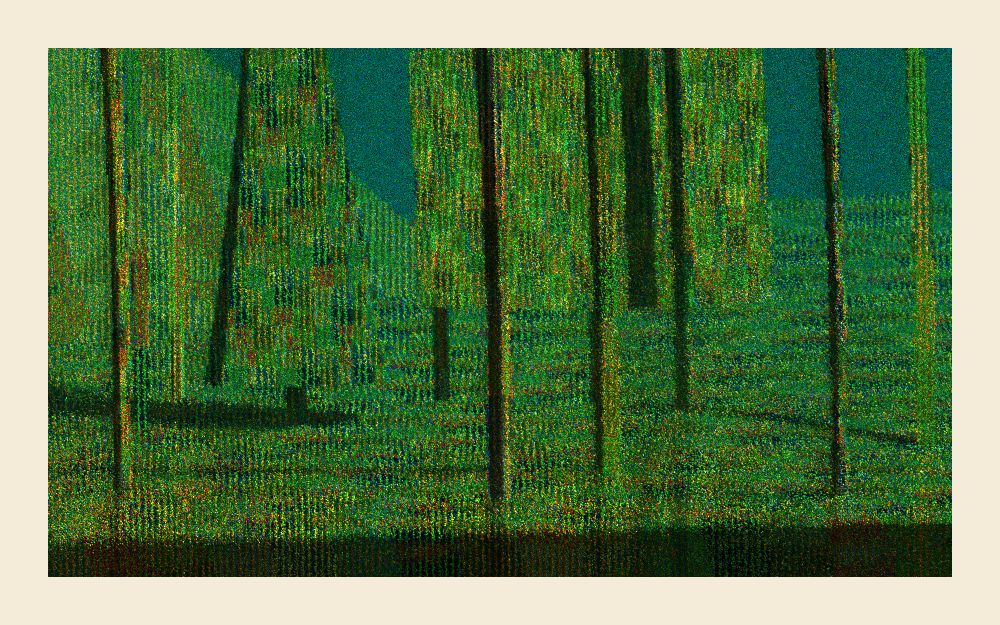 In a number of different tableaux, rendered in perspectiveless projection, the series evokes a very reduced sense of place, or perhaps recollection of place, sometimes with parts of the images blurred or distorted. In some scenes, even parts of the geometries are subject to erasure. In contrast to this barrenness, each scene is rich in saturation, movement and animated intensity, pulling the viewer into a chromatic world of its own peculiar logic.