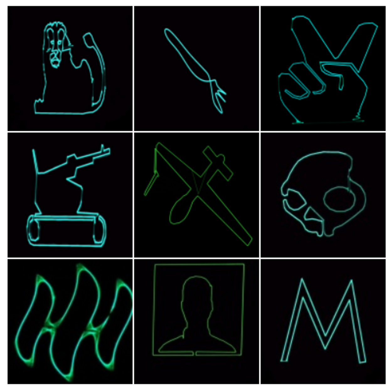 Inspired by computer art from 1950 which was displayed on oscilloscopes this Tic-Tac-Toe grid displays contemporary symbols of the games played today. Money, politics, war, death, internet, identity, trolls, crypto currency, information war and disinformation are all pieces in the game.
