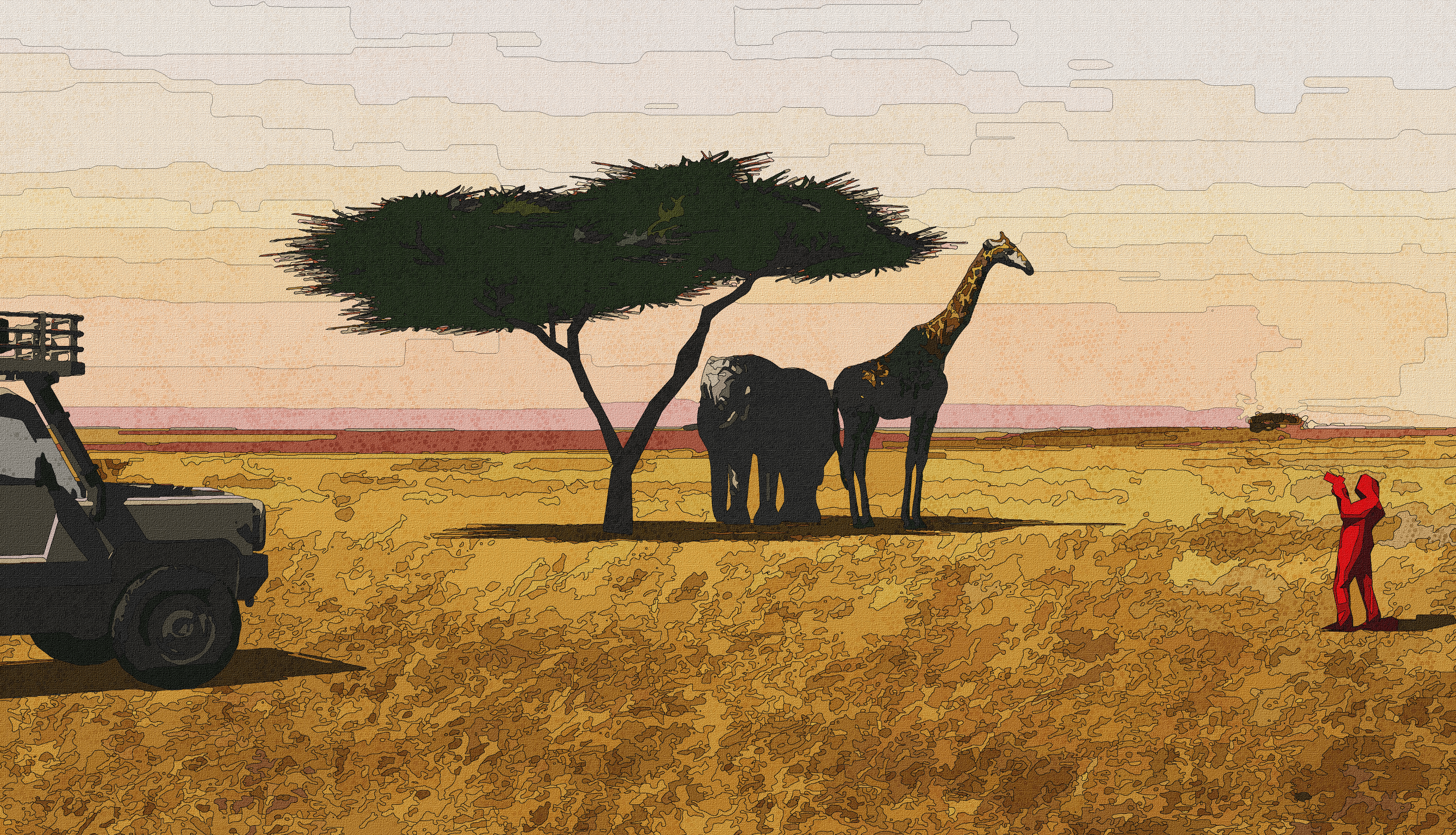 "Happy Safari: Golden Day" depicts a giraffe and elephant as meme icons in a magical and vibrant safari scene."