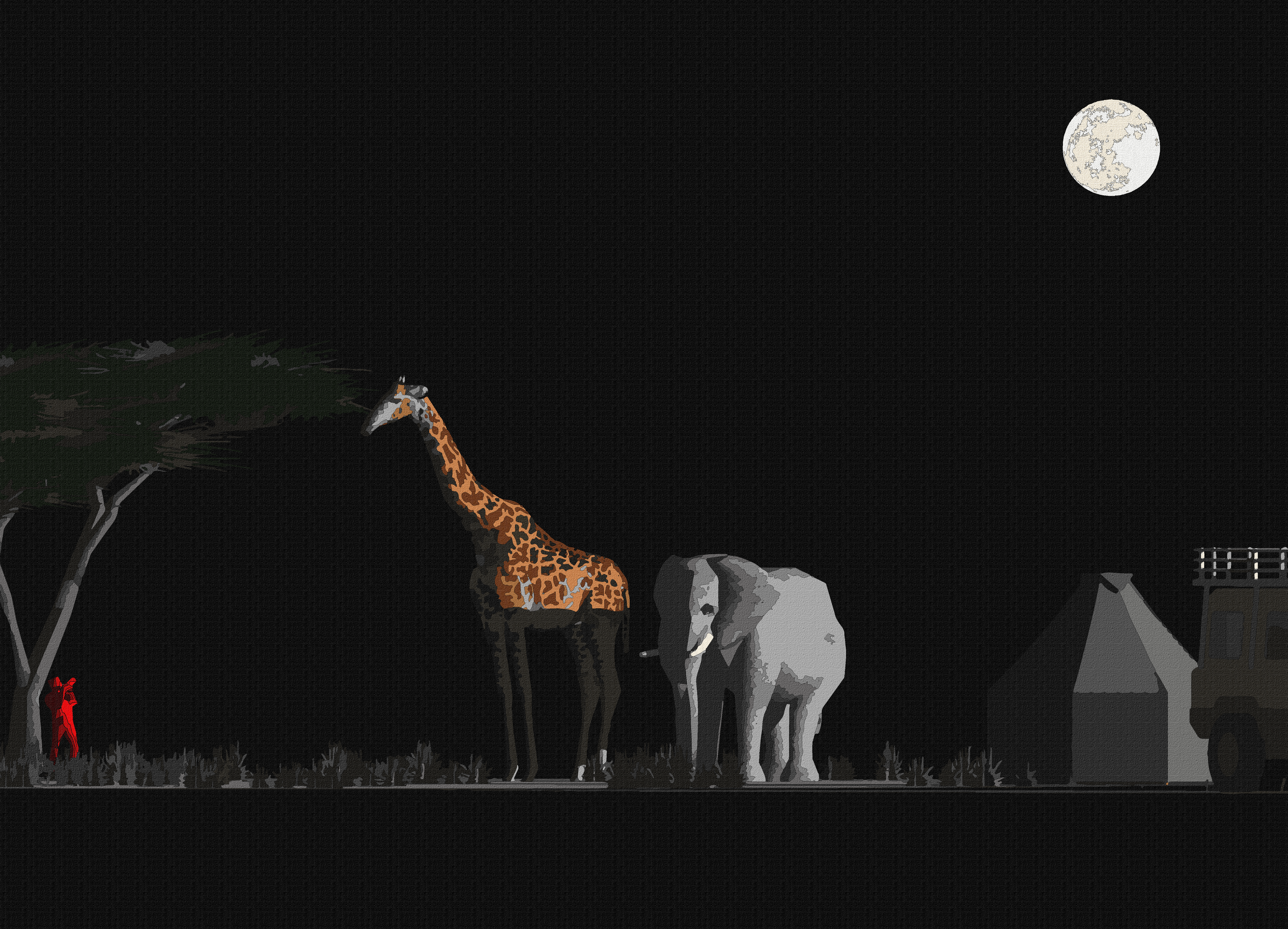"Happy Safari: Starry Night" depicts a giraffe and elephant as meme icons in a magical and vibrant safari scene.