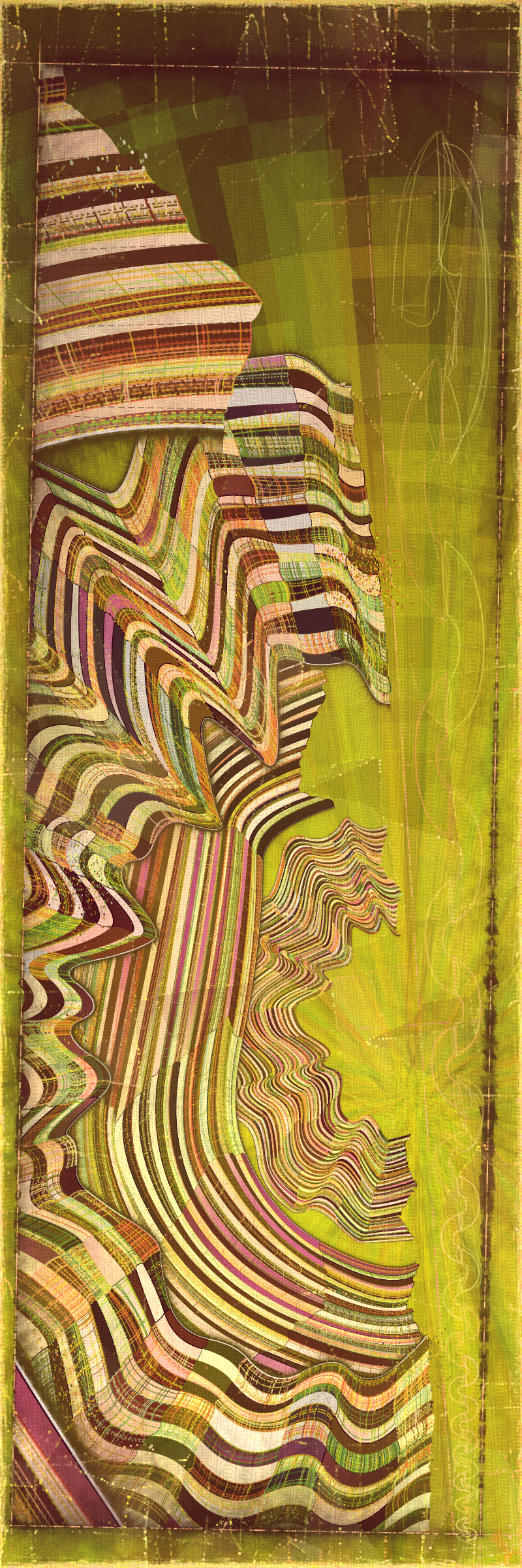 Using generative color algorithms has become a default part of my generative practice. Although I use a very limited color space, I’m very happy with the color expression in this project. The primary forms are not partially transparent unlike in the background elements in both Velum and Fontana. Instead I build layers of color using the grid markings and spindrift spots that overlay the quilt patches. Combined with the algorithmic distress and patches of color modulation the totality of color is continuously shifting. Ultimately I feel color, texture and form are one and abstracting one from the others can give us a false idea of how the whole will work.