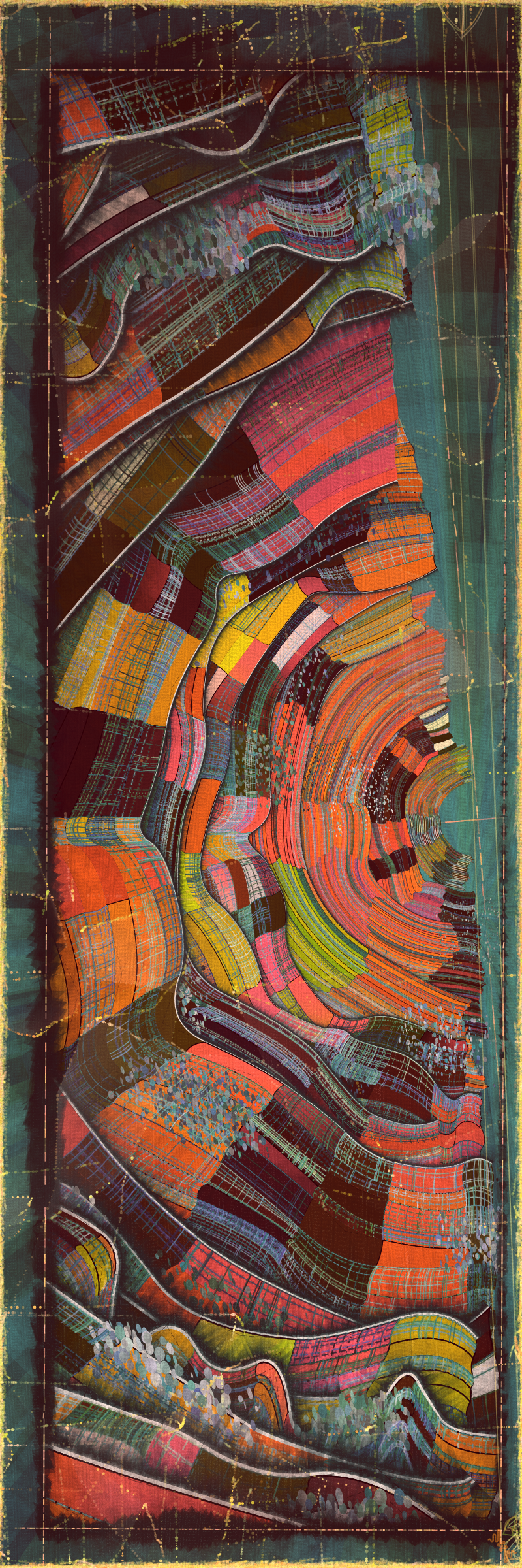 Using generative color algorithms has become a default part of my generative practice. Although I use a very limited color space, I’m very happy with the color expression in this project. The primary forms are not partially transparent unlike in the background elements in both Velum and Fontana. Instead I build layers of color using the grid markings and spindrift spots that overlay the quilt patches. Combined with the algorithmic distress and patches of color modulation the totality of color is continuously shifting. Ultimately I feel color, texture and form are one and abstracting one from the others can give us a false idea of how the whole will work.