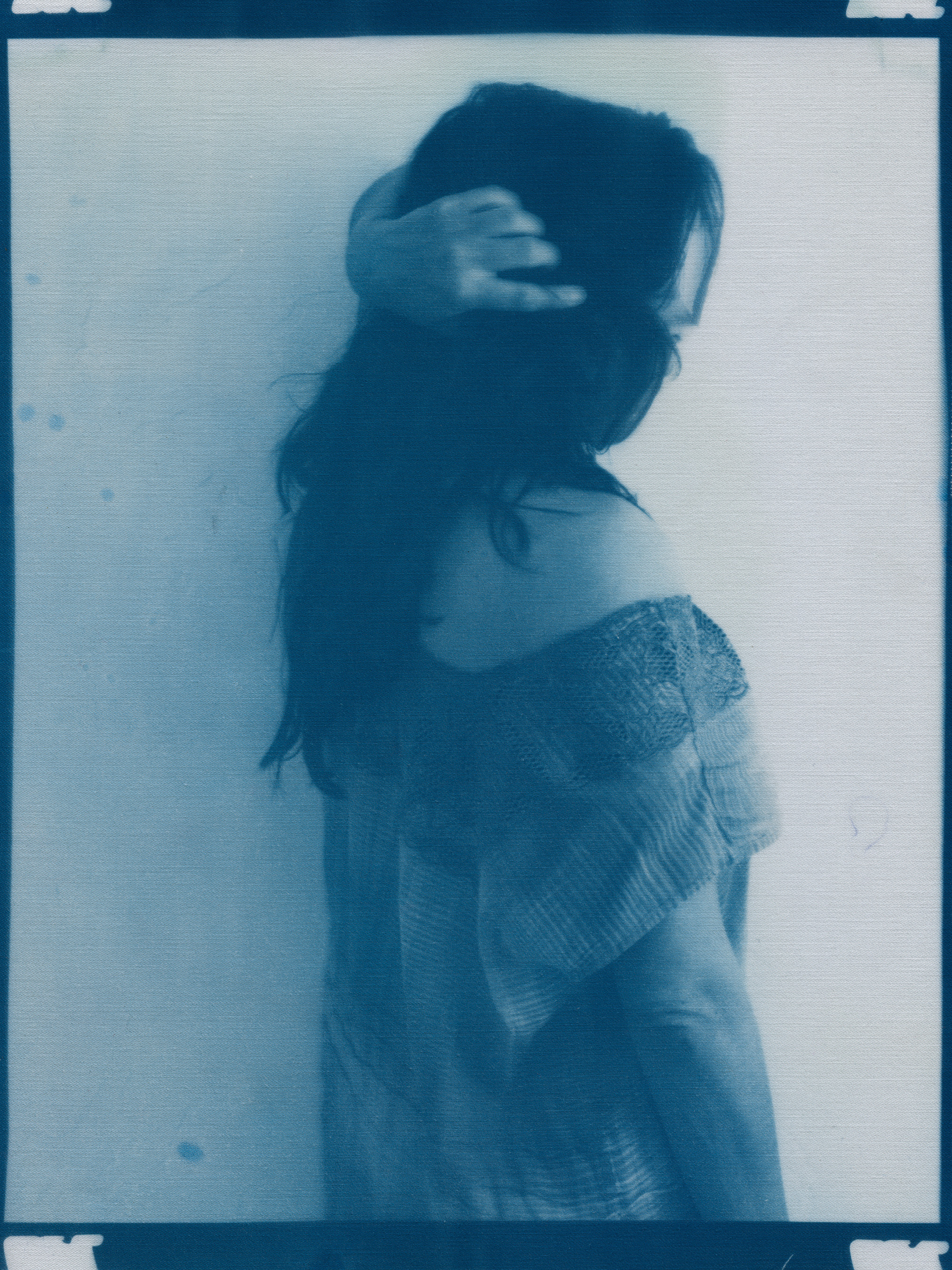 In the spring of 2020, panic surrounding COVID-19 erupted and mandatory shelter in place orders went into effect, forcing me to abandon long-planned portrait shoots, travel, and work in progress in my art studio. I found myself in a 340 sq ft apartment in a Bay-area neighborhood that was emptying by the day. The buzzing silence was profound. Two weeks into isolation, my drive to connect with others and make portraits only amplified. With no safe way to do so, I spontaneously turned the camera on myself to create a portrait. I printed it as a cyanotype, a simple nineteenth century photographic process that was only feasible due to the basic materials I happened to have on hand—a budget printer, transparency film and a package of fraying sheets of cotton pretreated with cyanotype chemicals. At first, I exposed the prints in the unpredictable spring sunlight coming through my third floor apartment window. As the seasons changed, I went on to make them in a garden, on the top of a car, or a patch of wobbly concrete tiles. I rinsed them in water and varying shades of blue emerged. I created a daily self-portrait using this technique for more than a year.