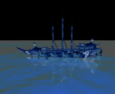 A hauntingly beautiful digital sculpture, 'Cursed Temporal Voyage' features a pirate galleon wrapped in a decaying flower garden and powered by sails bearing a neon evil eye. This spectral vessel navigates a vibrant, electric blue ocean under a dynamic sky that cycles through the artist's digital video and image compositions every hour, creating a constantly evolving, otherworldly scene.