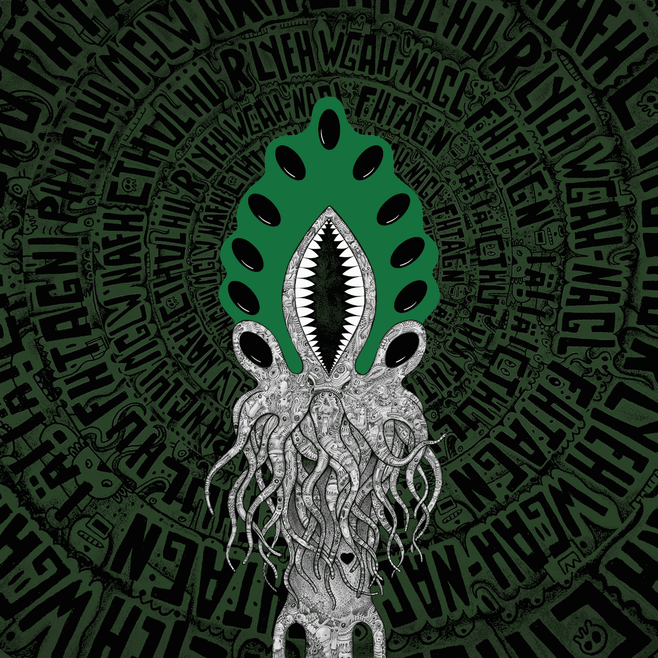 Straight from H. P. Lovecraft’s lines, Cthulhu came as a dream, or rather, as a nightmare urging Hackatao to wake up to art. Cthulhu’s hybrid nature, as divinity and priest, the way it lays dormant beyond death itself and its influence on humankind through psychic power are compelling. The alluring monster surfaces from a vortex of endless repetition: ph'nglui mglw'nafh Cthulhu R'lyeh wgah'nagl fhtagn is the mantra, as for Tibetan prayer wheels. Central, inescapable, crowned in sharp fangs, its wide mouth opens over the absolute vastness of a black hole, the very womb of the universe. The figure has a small heart on its chest. It is pitch black, but couldn’t it be the dot of good within the negative half of the Tao, the sign of love hacking hatred? What is certain is that Cthulhu is a demon as both a devil and a genius to Hackatao: as talent itself, it may lay dormant for a long time, but once waken by the cry “ia, ia, Cthulhu fhtagn,” no artist can resist its call. Read full article by Chiara Braidotti on https://medium.com/@hackatao/ia-ia-cthulhu-fhtagn-7e193d7ee6bc