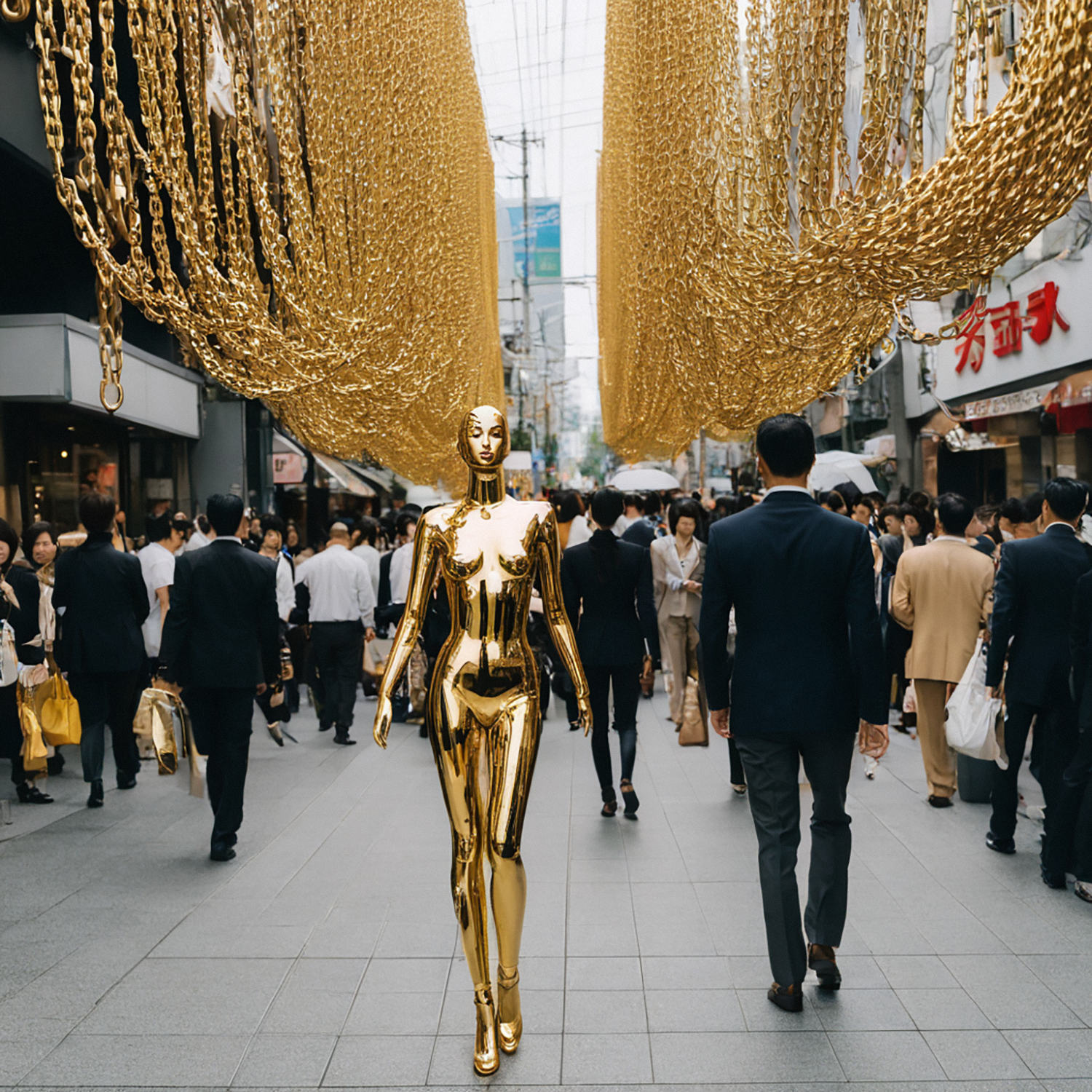 Amidst the bustling streets of Osaka, a woman adorned in chromed gold captures the attention of passersby with her radiant presence. Each step she takes is a gleaming testament to her boldness and confidence, the sunlight reflecting off her metallic ensemble casting shimmering patterns across the pavement. As she navigates through the vibrant cityscape, she becomes a vision of modern elegance amidst the eclectic energy of Osaka's bustling streets. Her striking appearance commands attention, drawing curious glances and admiring gazes from all who cross her path, a symbol of individuality and strength amidst the urban landscape.