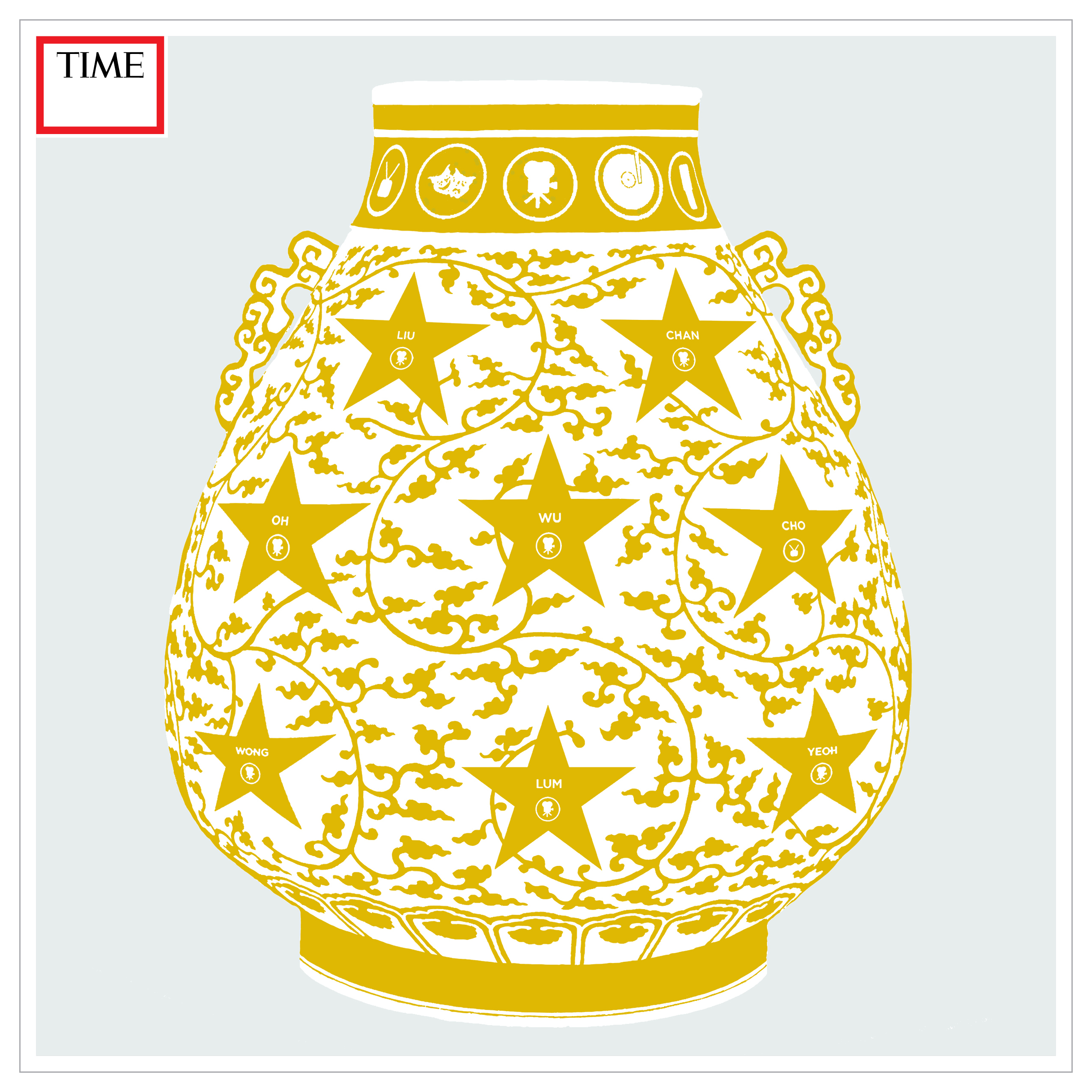 Eight stars with resembling stars along the Walk of Fame are dispersed throughout this vase. Surnames are featured on each star. This piece discusses the role of Asian female representation in Western media. The colour yellow is used to resemble the colour of stars, of skin, of self-image. Future Relics is a series of ten paintings that I have created since 2019 using the iconography of Chinese classical art to express the themes of women, femininity and female sensibility in the 21st century. These paintings are created both digitally and physically. Its physical version is rendered in egg shells.