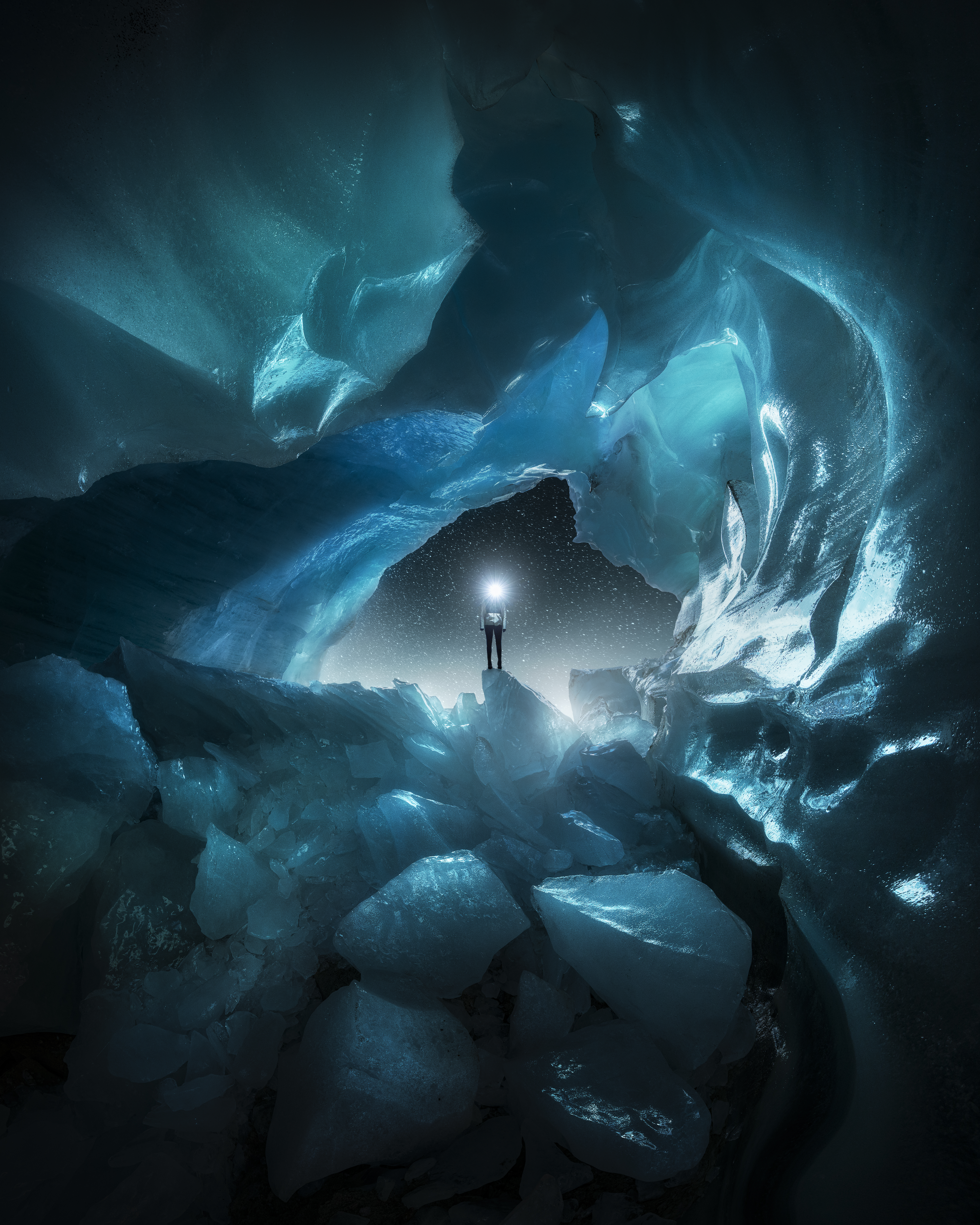 Memories of a dangerous solo glacier exploration deep into the wilderness of British Columbia. A place where I risked my life taking this image, leaving my mind to wander through existential questions about life, death, and the afterlife. // A bright light. Transcendence of Ego and spatiotemporal boundaries. Altered time perception, entering an unearthly environment. Mind and body co-existing in duality but separated. Moving through a tunnel filled with blue velvet darkness. Uncontrollable attraction to a brilliant light, a feeling of becoming one with it. Is it myself? A lifting mind, an overwhelming sense of peace and well-being. Floating in silence, fearless. Pain existing more in imagination than reality. This light again. An endless end.