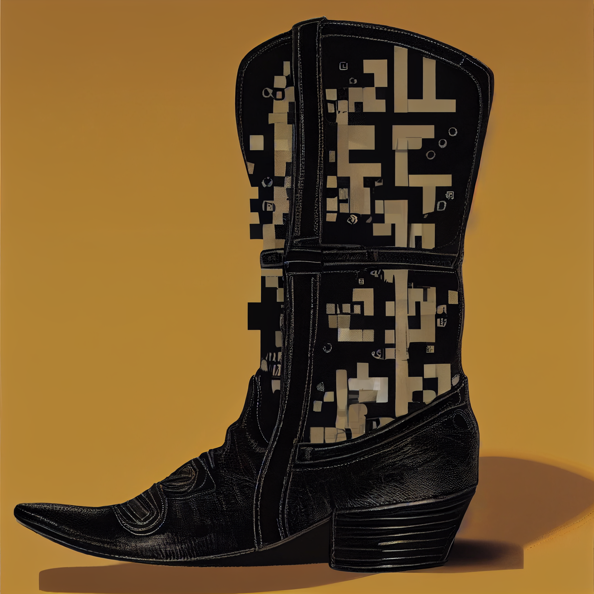 WENT THROUGH AT LEAST A 1000 GENERATIVE BOOTS TO MOLD THIS SPECIFIC MODEL. I KEPT THE GLITCH CUT ON THE UPPER SECTION, SOMETIMES I LIKE THE A.I. GLITCH WHEN IT HAPPENS. OPTED FOR A MORE ILLUSTRATIVE EFFECT THAN A REALIST SHOT OF THE BOOT TO KEEP SOME WESTERN POSTER/BILL PRINT VIBES FOR ADDED EFFECT.
