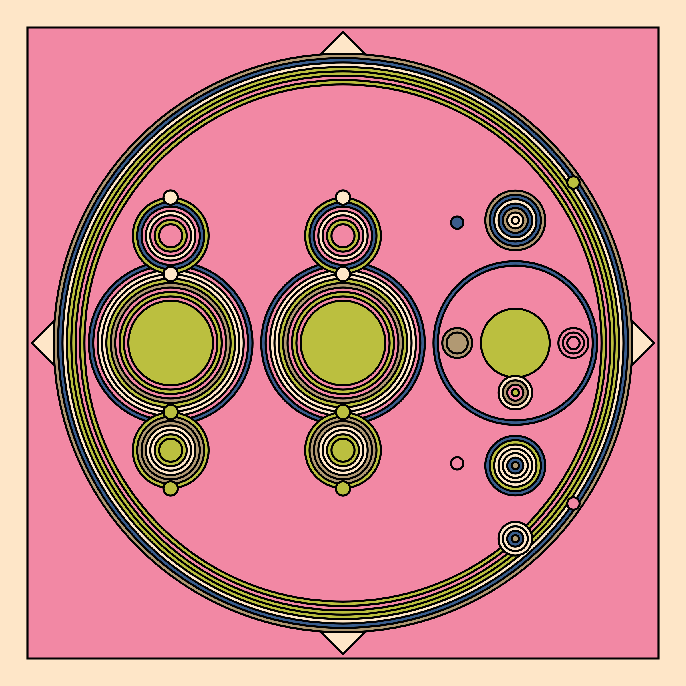 Project Description: A study in composition using simple shapes and layout rules. When repetitive patterns fail, and the symmetry isn't quite right, the images are strangely evocative. Somewhere between art deco, pop art, and sci-fi.