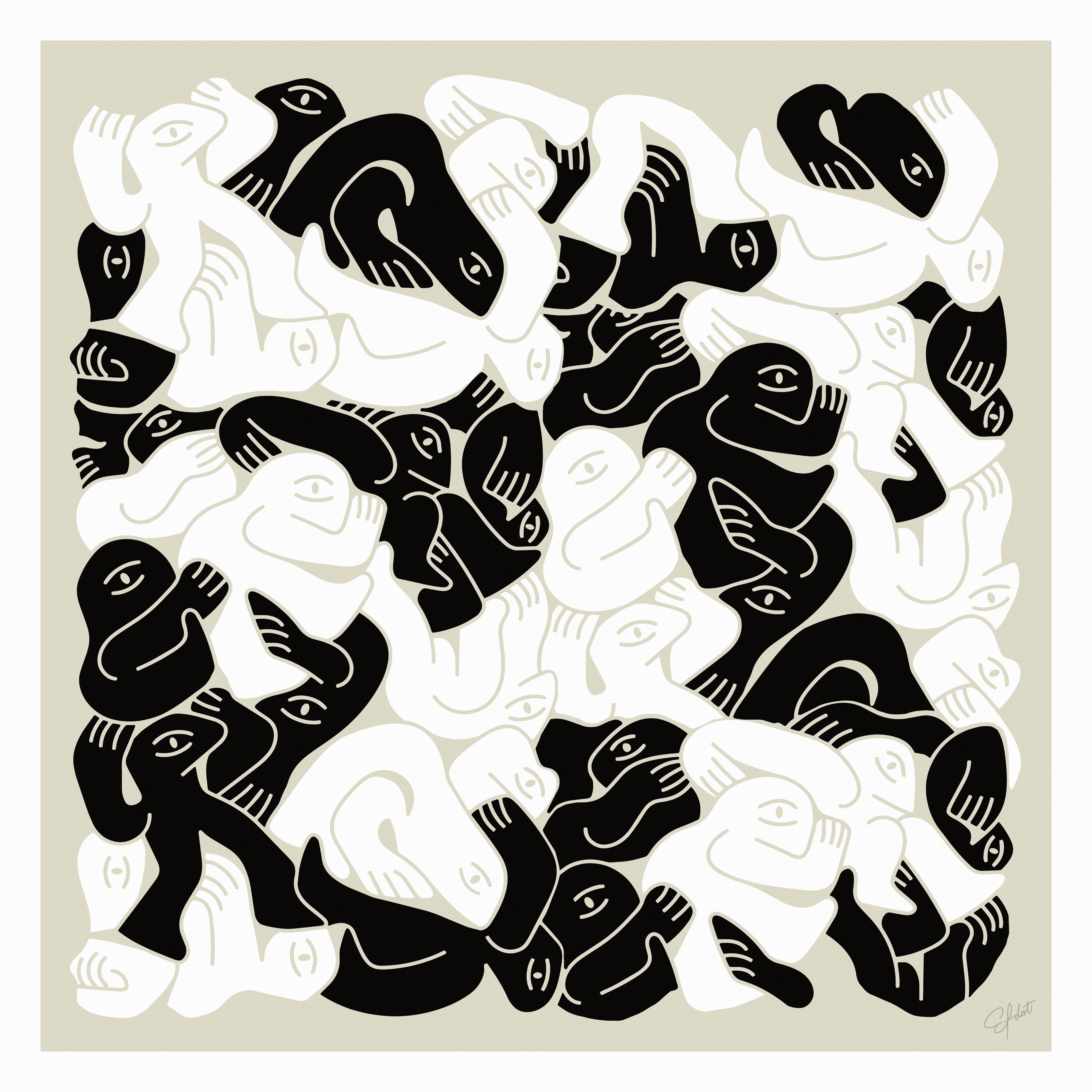 With inspiration from MC Escher's famous tessellations, "Push Through" came out of Efdot's early explorations with the Blob forming positive and negative space, pre-dating the artist's work with color and abstraction.