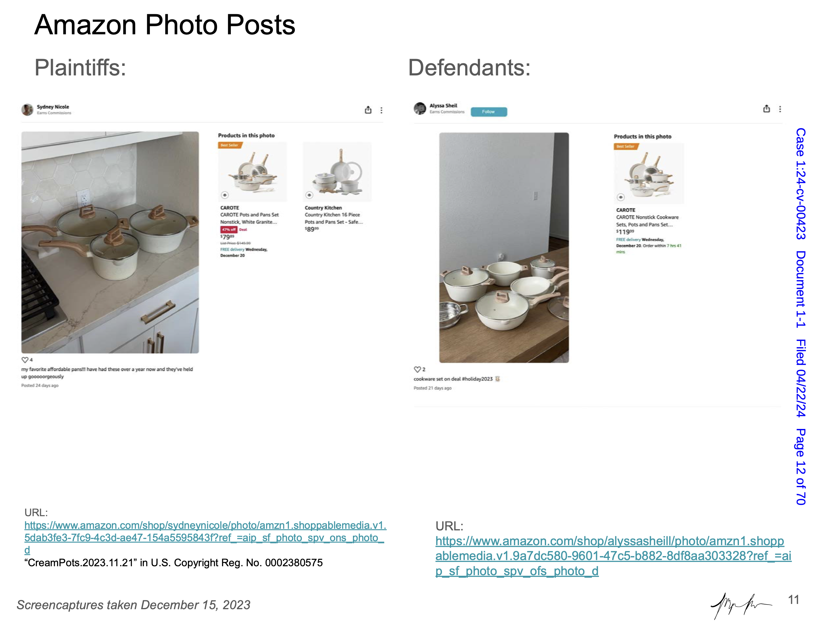 Maya Man is an artist focused on contemporary identity culture on the internet. Her work examines dominant narratives around femininity, authenticity, and the performance of self online. In Hard Copy she examines a lawsuit between influencers Sydney Nicole Gifford and Alyssa Sheil, colloquially known as the “Sad Beige Lawsuit,” in which Gifford accused Sheil of replicating her content—from decor, to clothes, to nearly every aspect of her online persona. Each artwork is a page from an official legal document, taken directly from court filings and electronically signed by the artist. Presented as side-by-side comparisons and complete with screenshots from various social media platforms, websites, and hyperlinks, the pages fit naturally within Man’s work, even though the artifacts themselves are, in effect, stolen.