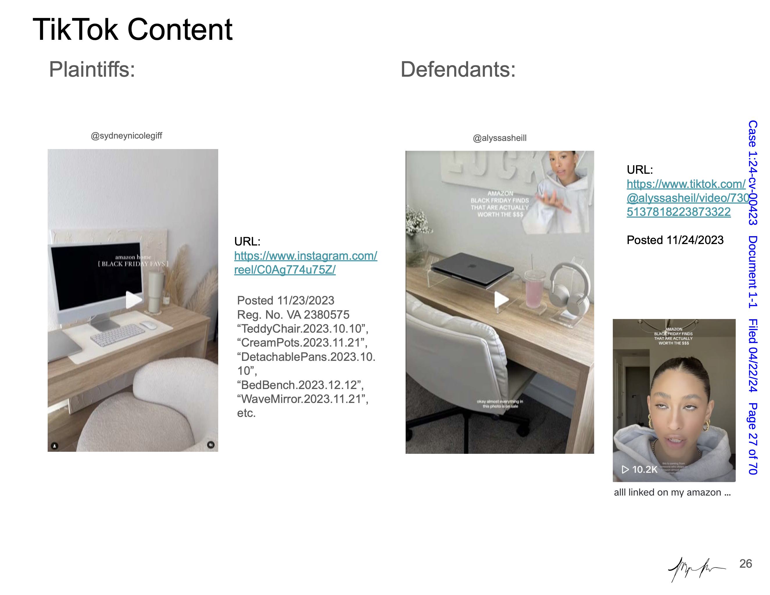 Maya Man is an artist focused on contemporary identity culture on the internet. Her work examines dominant narratives around femininity, authenticity, and the performance of self online. In Hard Copy she examines a lawsuit between influencers Sydney Nicole Gifford and Alyssa Sheil, colloquially known as the “Sad Beige Lawsuit,” in which Gifford accused Sheil of replicating her content—from decor, to clothes, to nearly every aspect of her online persona. Each artwork is a page from an official legal document, taken directly from court filings and electronically signed by the artist. Presented as side-by-side comparisons and complete with screenshots from various social media platforms, websites, and hyperlinks, the pages fit naturally within Man’s work, even though the artifacts themselves are, in effect, stolen.