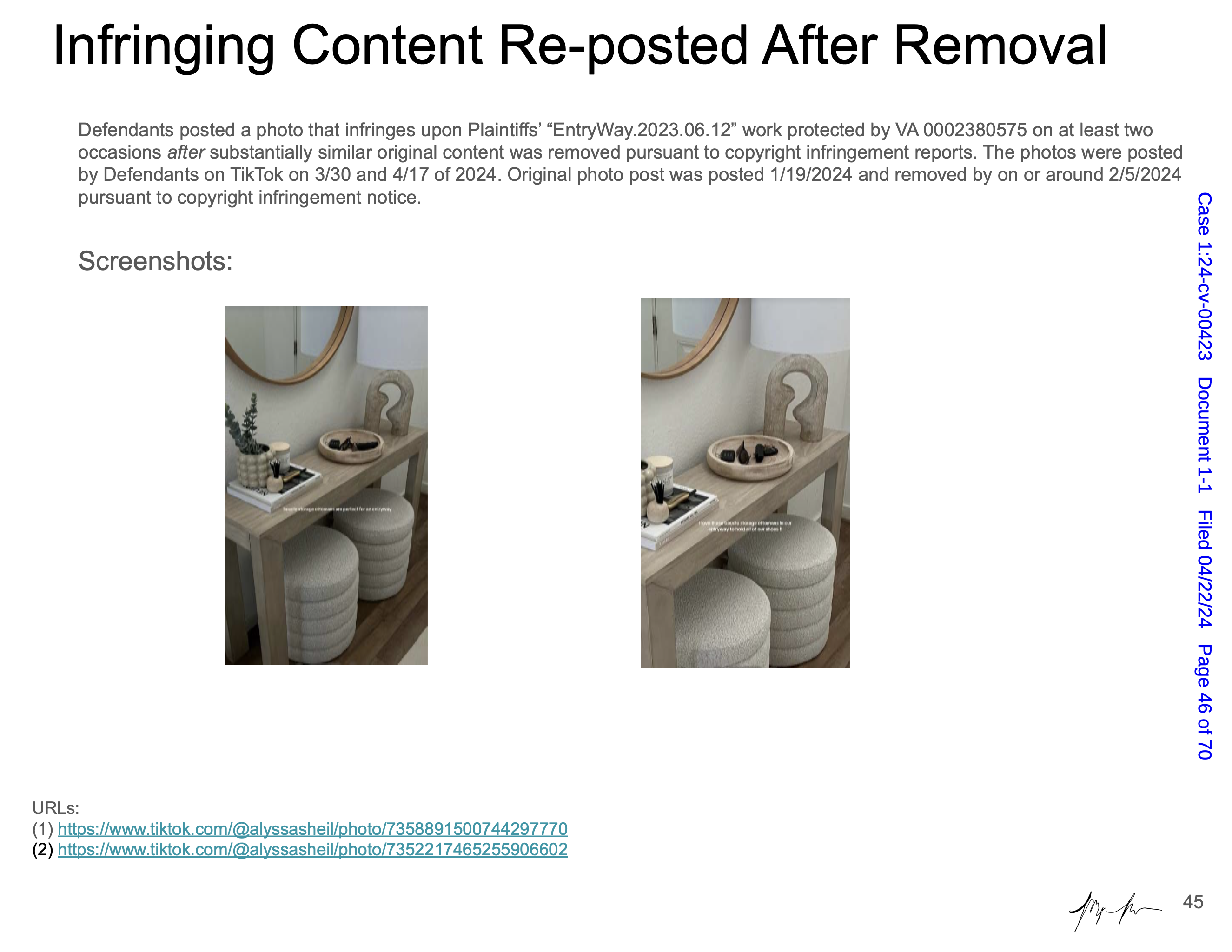 Maya Man is an artist focused on contemporary identity culture on the internet. Her work examines dominant narratives around femininity, authenticity, and the performance of self online. In Hard Copy she examines a lawsuit between influencers Sydney Nicole Gifford and Alyssa Sheil, colloquially known as the “Sad Beige Lawsuit,” in which Gifford accused Sheil of replicating her content—from decor, to clothes, to nearly every aspect of her online persona. Each artwork is a page from an official legal document, taken directly from court filings and electronically signed by the artist. Presented as side-by-side comparisons and complete with screenshots from various social media platforms, websites, and hyperlinks, the pages fit naturally within Man’s work, even though the artifacts themselves are, in effect, stolen.