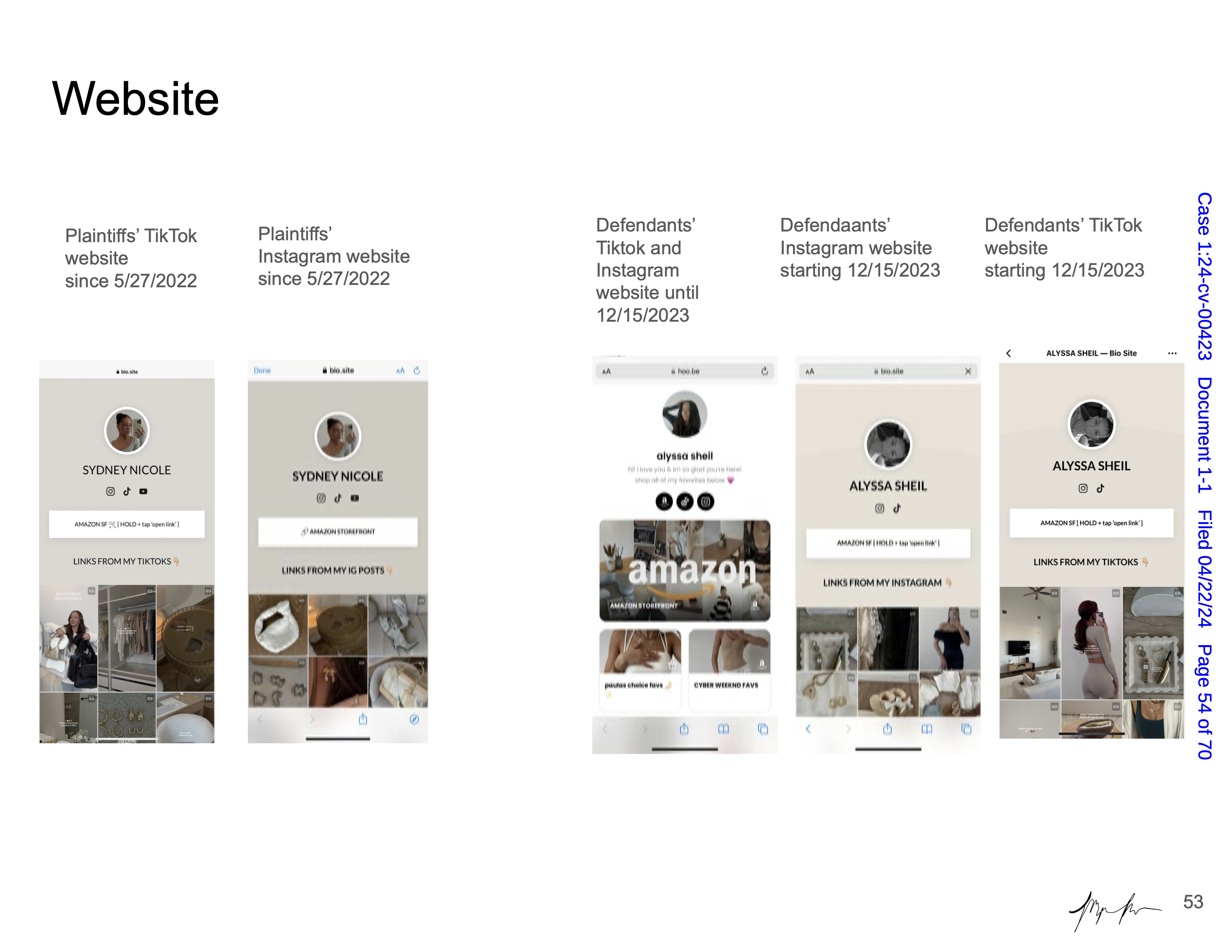 Maya Man is an artist focused on contemporary identity culture on the internet. Her work examines dominant narratives around femininity, authenticity, and the performance of self online. In Hard Copy she examines a lawsuit between influencers Sydney Nicole Gifford and Alyssa Sheil, colloquially known as the “Sad Beige Lawsuit,” in which Gifford accused Sheil of replicating her content—from decor, to clothes, to nearly every aspect of her online persona. Each artwork is a page from an official legal document, taken directly from court filings and electronically signed by the artist. Presented as side-by-side comparisons and complete with screenshots from various social media platforms, websites, and hyperlinks, the pages fit naturally within Man’s work, even though the artifacts themselves are, in effect, stolen.