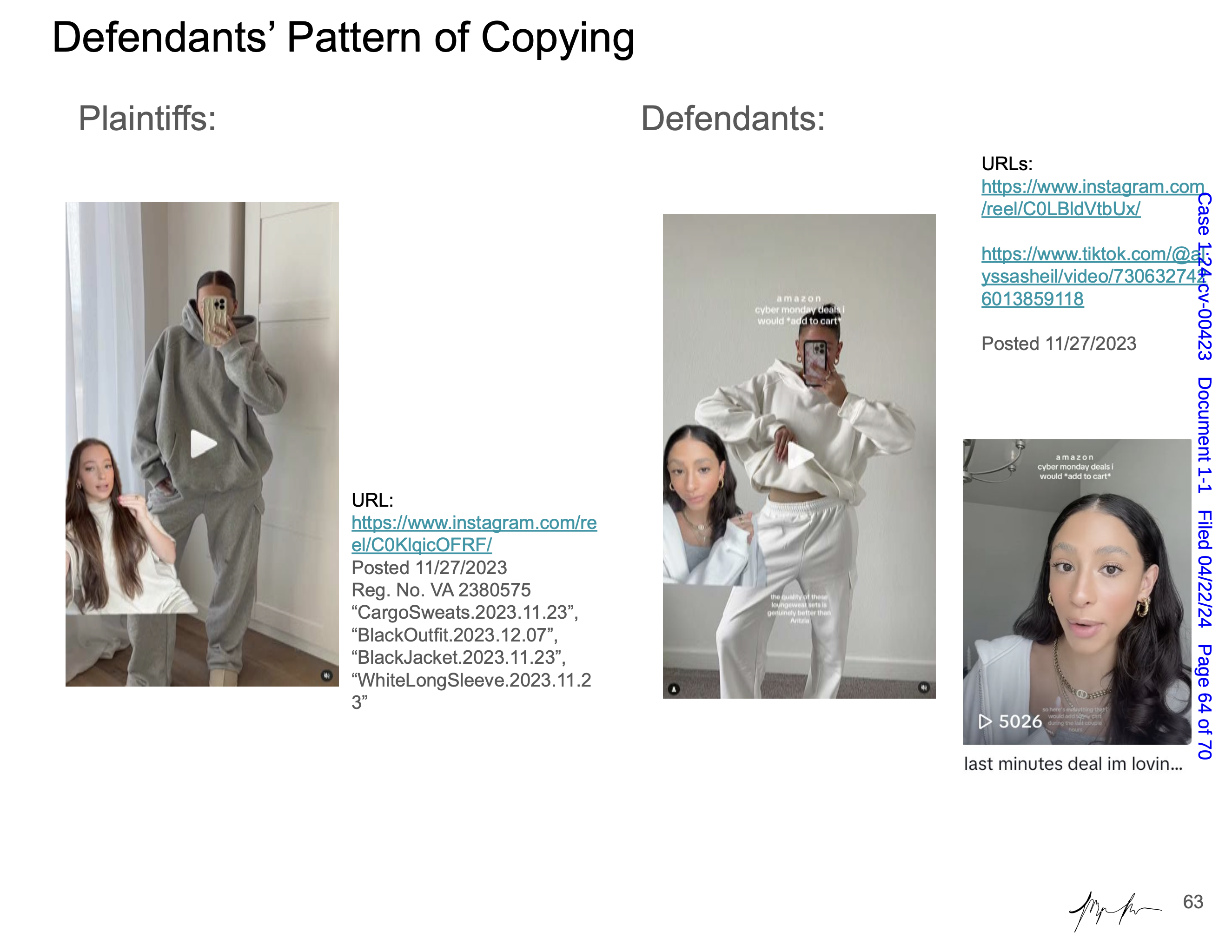 Maya Man is an artist focused on contemporary identity culture on the internet. Her work examines dominant narratives around femininity, authenticity, and the performance of self online. In Hard Copy she examines a lawsuit between influencers Sydney Nicole Gifford and Alyssa Sheil, colloquially known as the “Sad Beige Lawsuit,” in which Gifford accused Sheil of replicating her content—from decor, to clothes, to nearly every aspect of her online persona. Each artwork is a page from an official legal document, taken directly from court filings and electronically signed by the artist. Presented as side-by-side comparisons and complete with screenshots from various social media platforms, websites, and hyperlinks, the pages fit naturally within Man’s work, even though the artifacts themselves are, in effect, stolen.