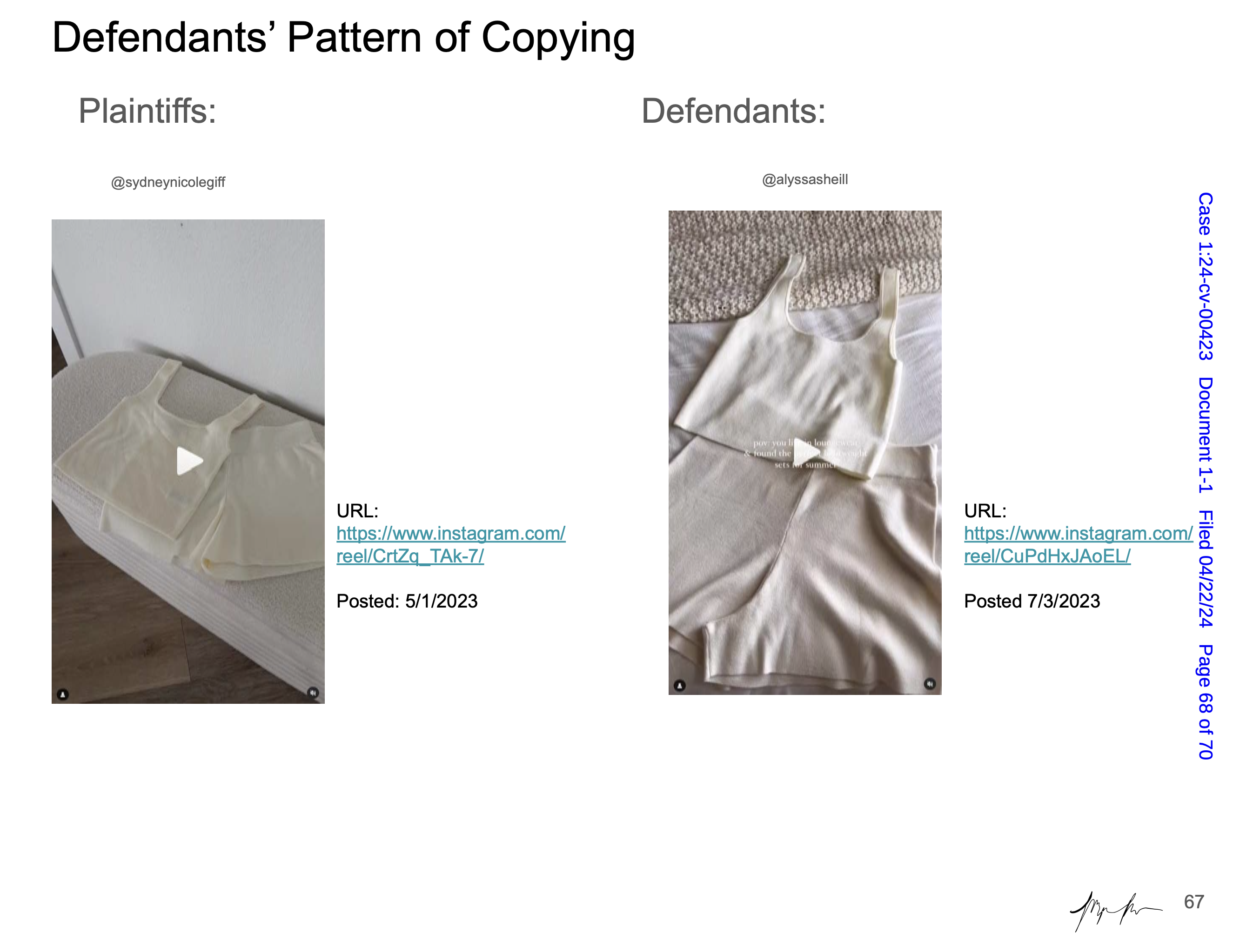 Maya Man is an artist focused on contemporary identity culture on the internet. Her work examines dominant narratives around femininity, authenticity, and the performance of self online. In Hard Copy she examines a lawsuit between influencers Sydney Nicole Gifford and Alyssa Sheil, colloquially known as the “Sad Beige Lawsuit,” in which Gifford accused Sheil of replicating her content—from decor, to clothes, to nearly every aspect of her online persona. Each artwork is a page from an official legal document, taken directly from court filings and electronically signed by the artist. Presented as side-by-side comparisons and complete with screenshots from various social media platforms, websites, and hyperlinks, the pages fit naturally within Man’s work, even though the artifacts themselves are, in effect, stolen.