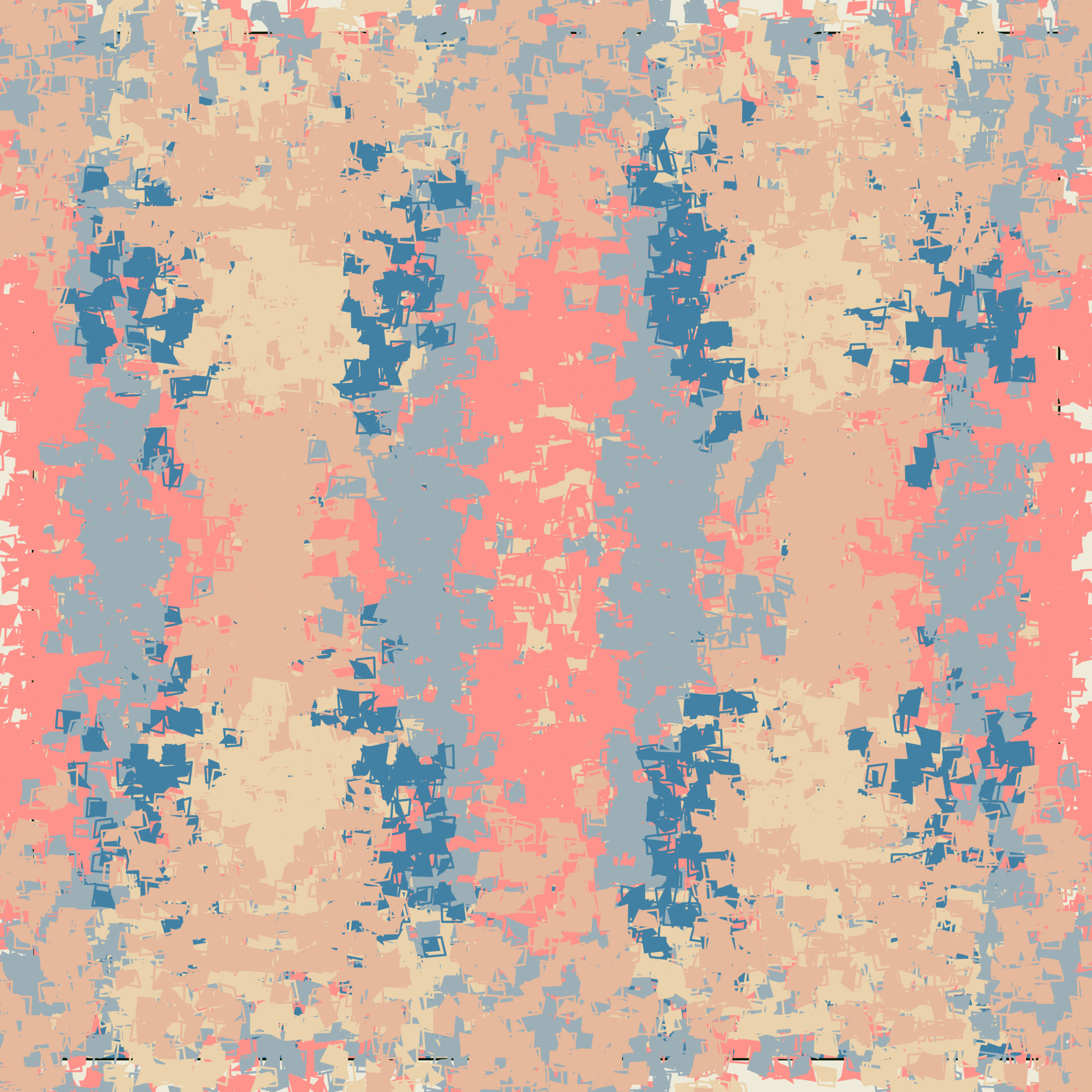 Each layer is built organically square by square which are then deformed at their corners. There are chances for countless variations through tighter density, symmetry, deformation strength, and color. There is even a chance that the inhabitants will architect the impossible and reach for another canvas, breaking free of their own border.
