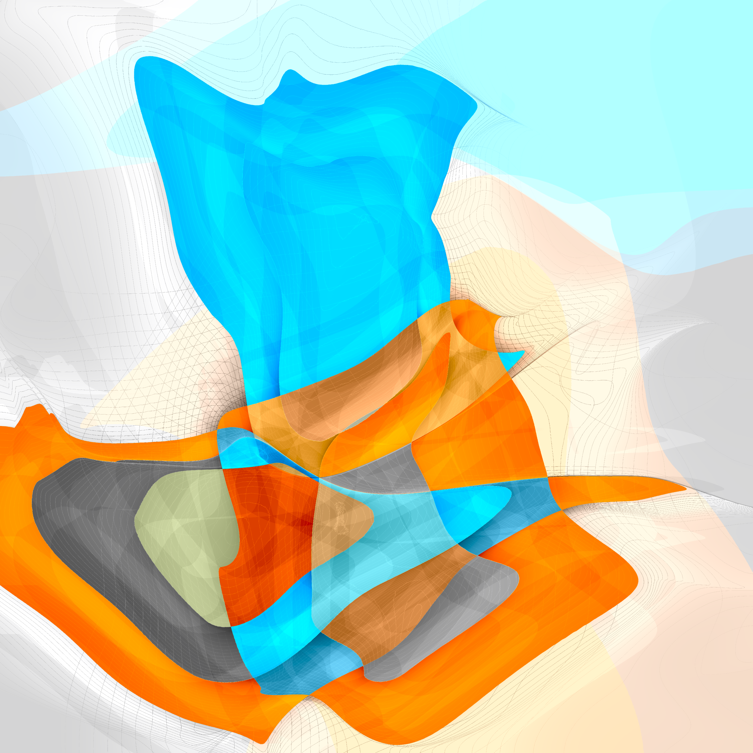 “Alchimie” is an enchanting display of colours and structures. Starting from the basic selection of two colours from a carefully curated palette and a series of random squares, the algorithm transforms these squares into complex, flowing, sophisticated structures with a rich spectrum of shades derived from the original colours.
