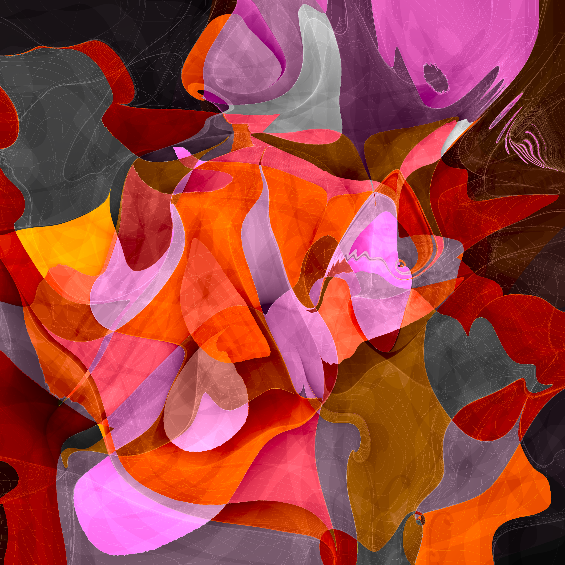 “Alchimie” is an enchanting display of colours and structures. Starting from the basic selection of two colours from a carefully curated palette and a series of random squares, the algorithm transforms these squares into complex, flowing, sophisticated structures with a rich spectrum of shades derived from the original colours.