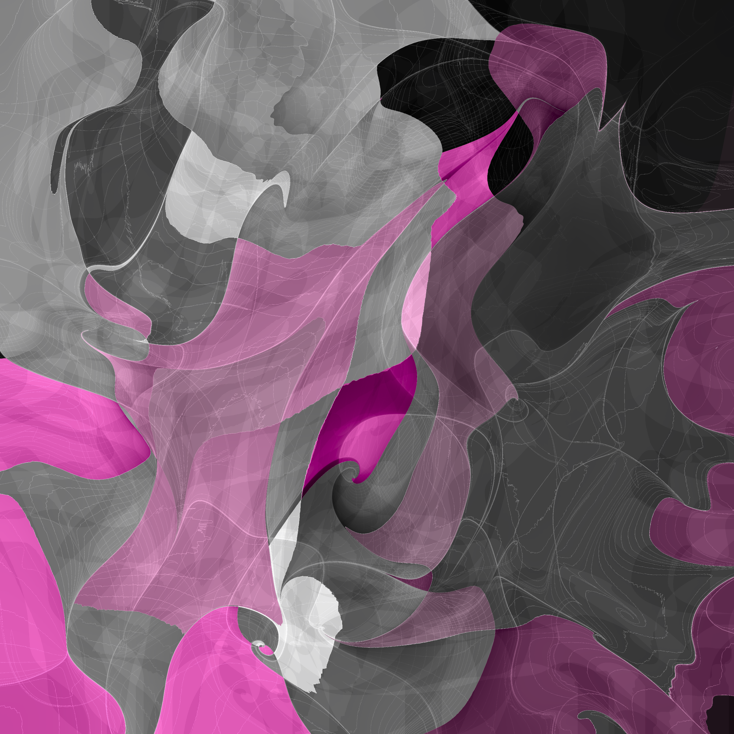 “Alchimie” is an enchanting display of colours and structures. Starting from the basic selection of two colours from a carefully curated palette and a series of random squares, the algorithm transforms these squares into complex, flowing, sophisticated structures with a rich spectrum of shades derived from the original colours.