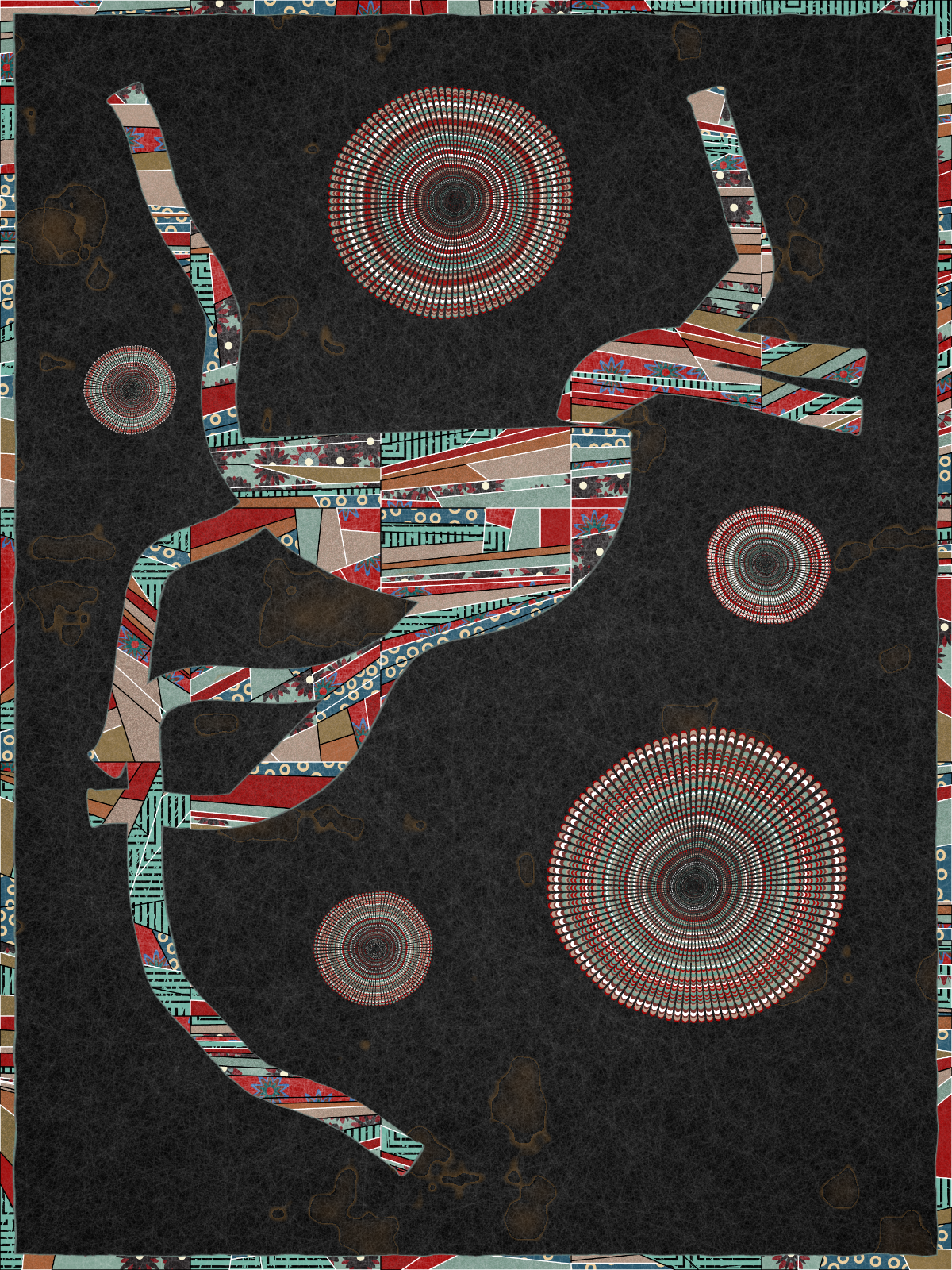 Made entirely with code, Interwoven draws inspiration from the 1986 Bullseye Quilt by Martha Lou Jones in LACMA’s collection, meditating on the quilt’s underlying tension between the computational and handmade through a distinctive patchwork style. The algorithm uses randomness to give rise to creature-like forms in order to embody the narrative elements so integral to the tradition of quilt-making.