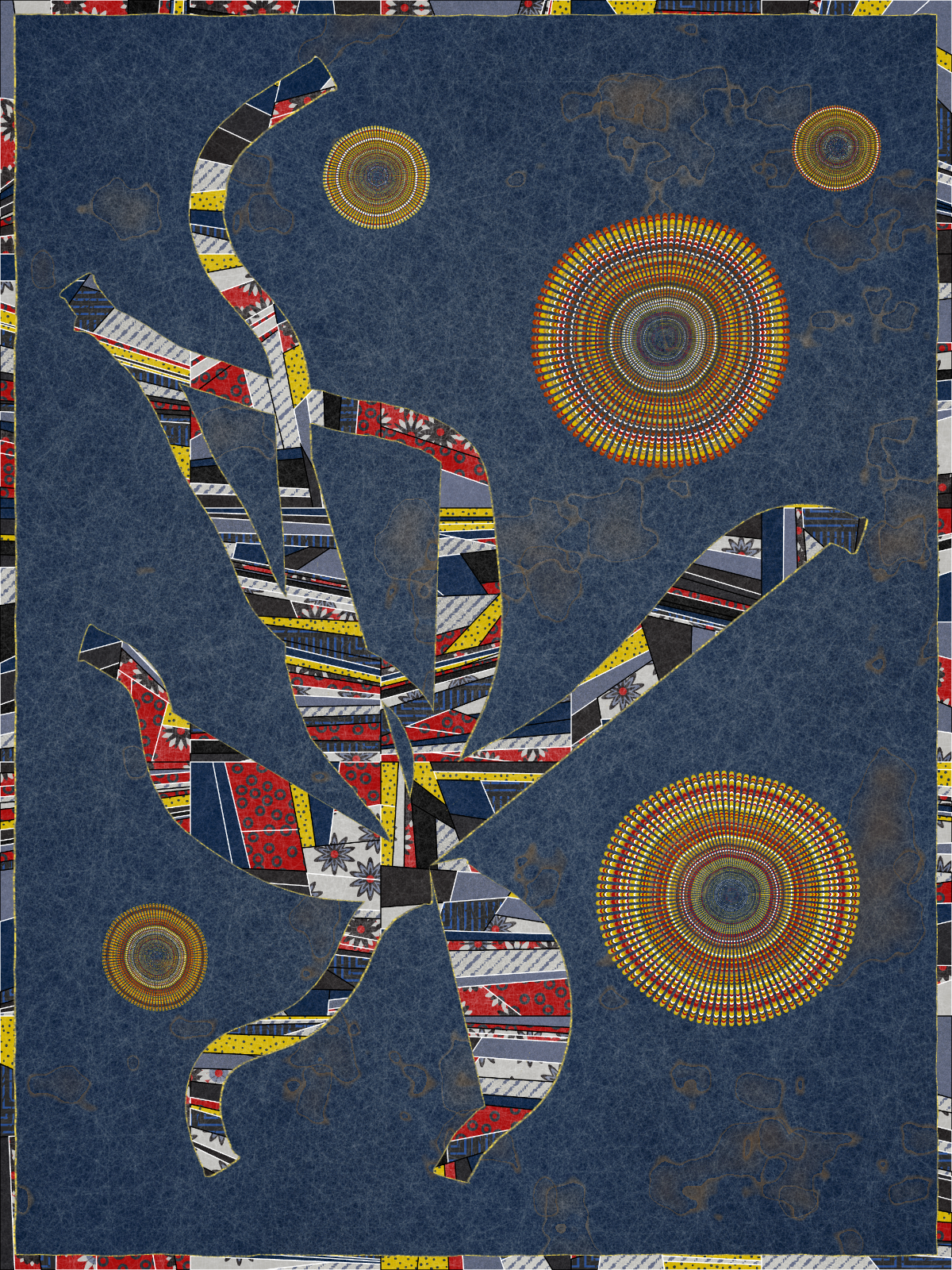 Made entirely with code, Interwoven draws inspiration from the 1986 Bullseye Quilt by Martha Lou Jones in LACMA’s collection, meditating on the quilt’s underlying tension between the computational and handmade through a distinctive patchwork style. The algorithm uses randomness to give rise to creature-like forms in order to embody the narrative elements so integral to the tradition of quilt-making.