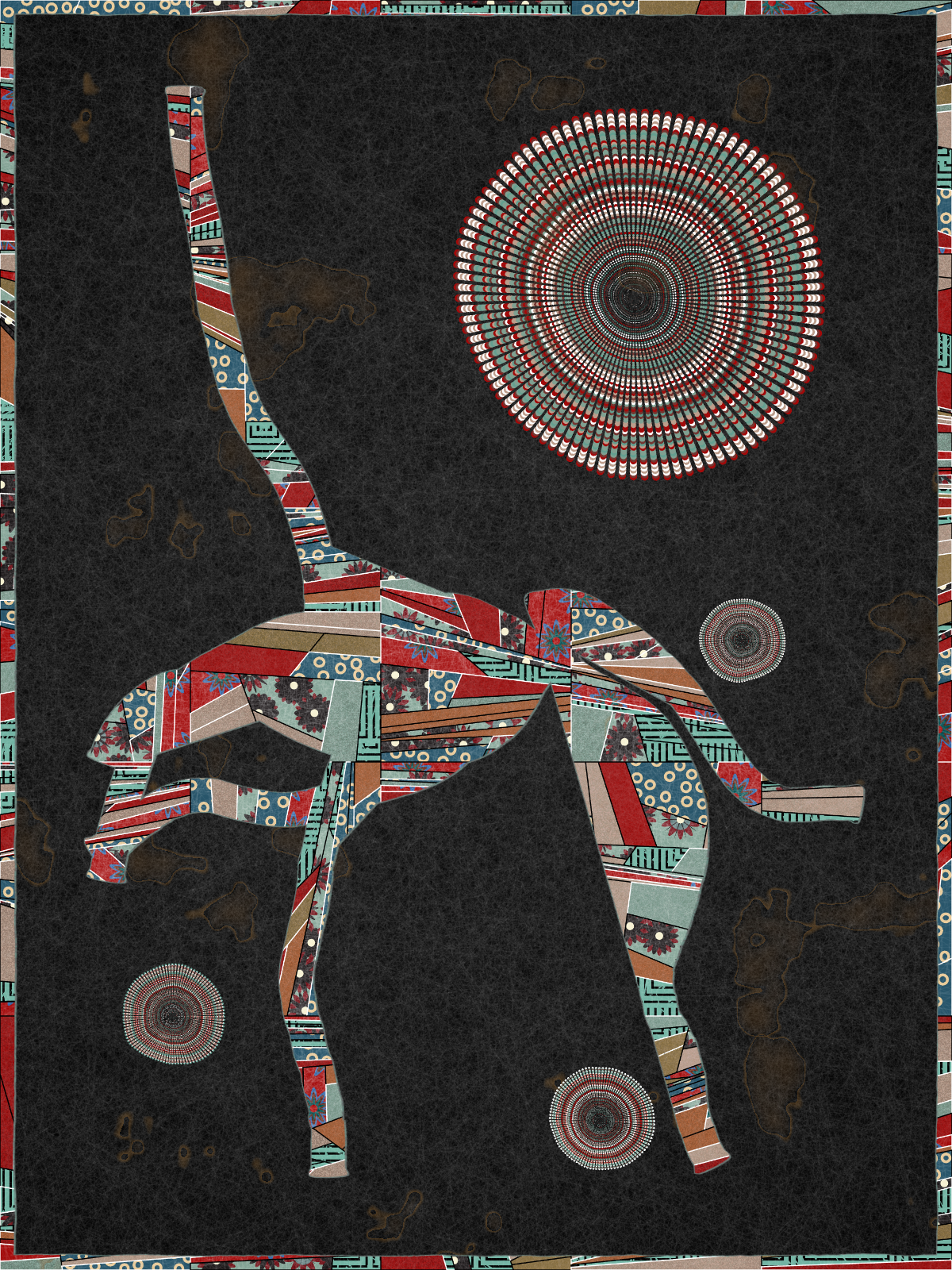 Made entirely with code, Interwoven draws inspiration from the 1986 Bullseye Quilt by Martha Lou Jones in LACMA’s collection, meditating on the quilt’s underlying tension between the computational and handmade through a distinctive patchwork style. The algorithm uses randomness to give rise to creature-like forms in order to embody the narrative elements so integral to the tradition of quilt-making.