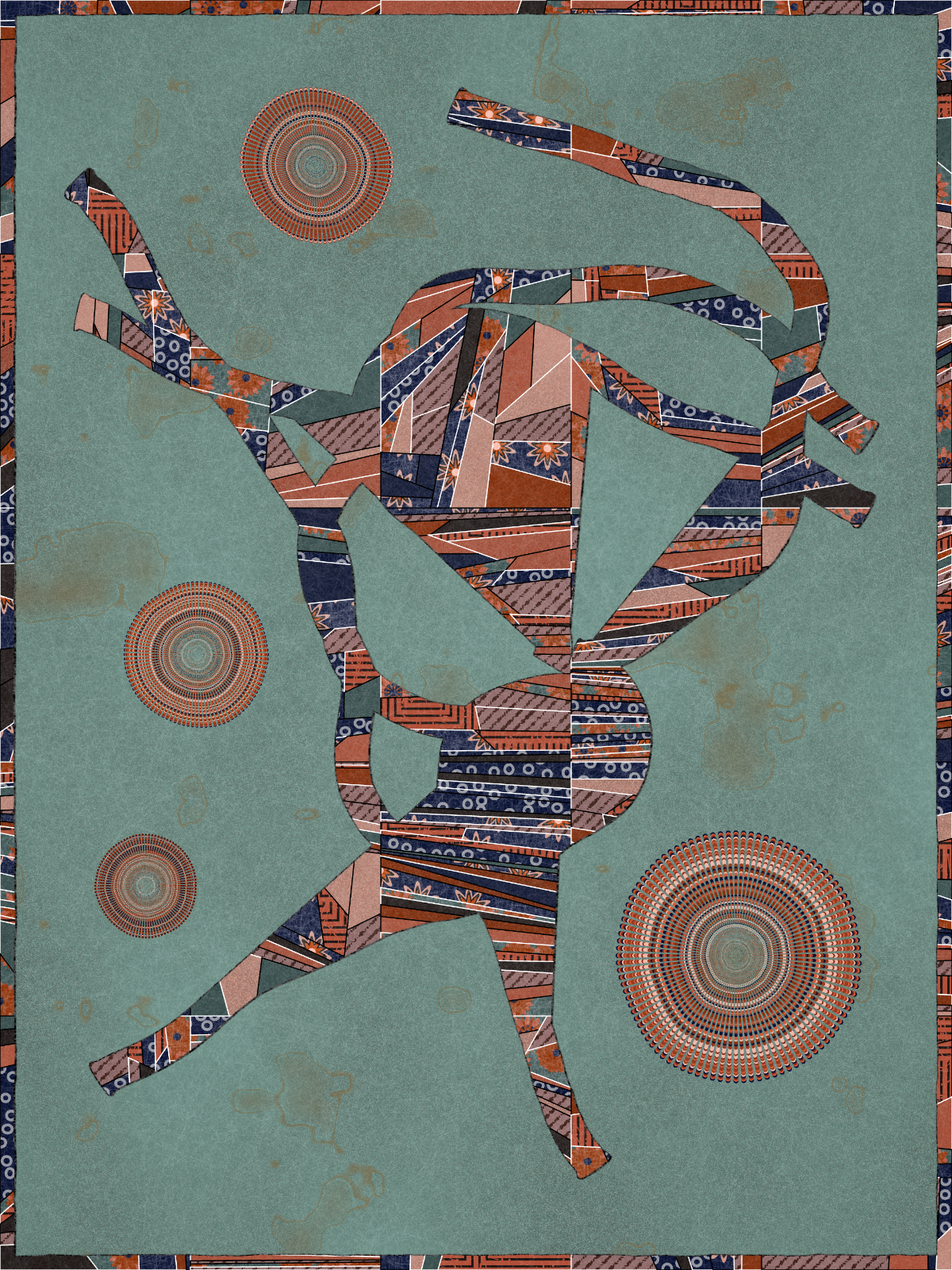 Made entirely with code, Interwoven draws inspiration from the 1986 Bullseye Quilt by Martha Lou Jones in LACMA’s collection, meditating on the quilt’s underlying tension between the computational and handmade through a distinctive patchwork style. The algorithm uses randomness to give rise to creature-like forms in order to embody the narrative elements so integral to the tradition of quilt-making.