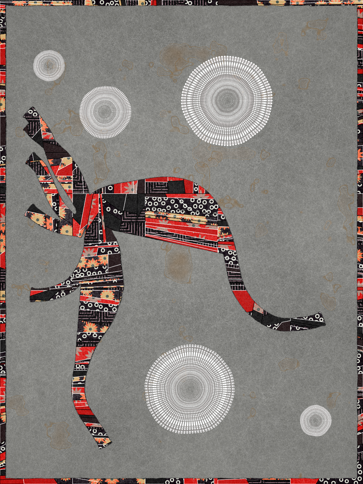Made entirely with code, Interwoven draws inspiration from the 1986 Bullseye Quilt by Martha Lou Jones in LACMA’s collection, meditating on the quilt’s underlying tension between the computational and handmade through a distinctive patchwork style. The algorithm uses randomness to give rise to creature-like forms in order to embody the narrative elements so integral to the tradition of quilt-making.