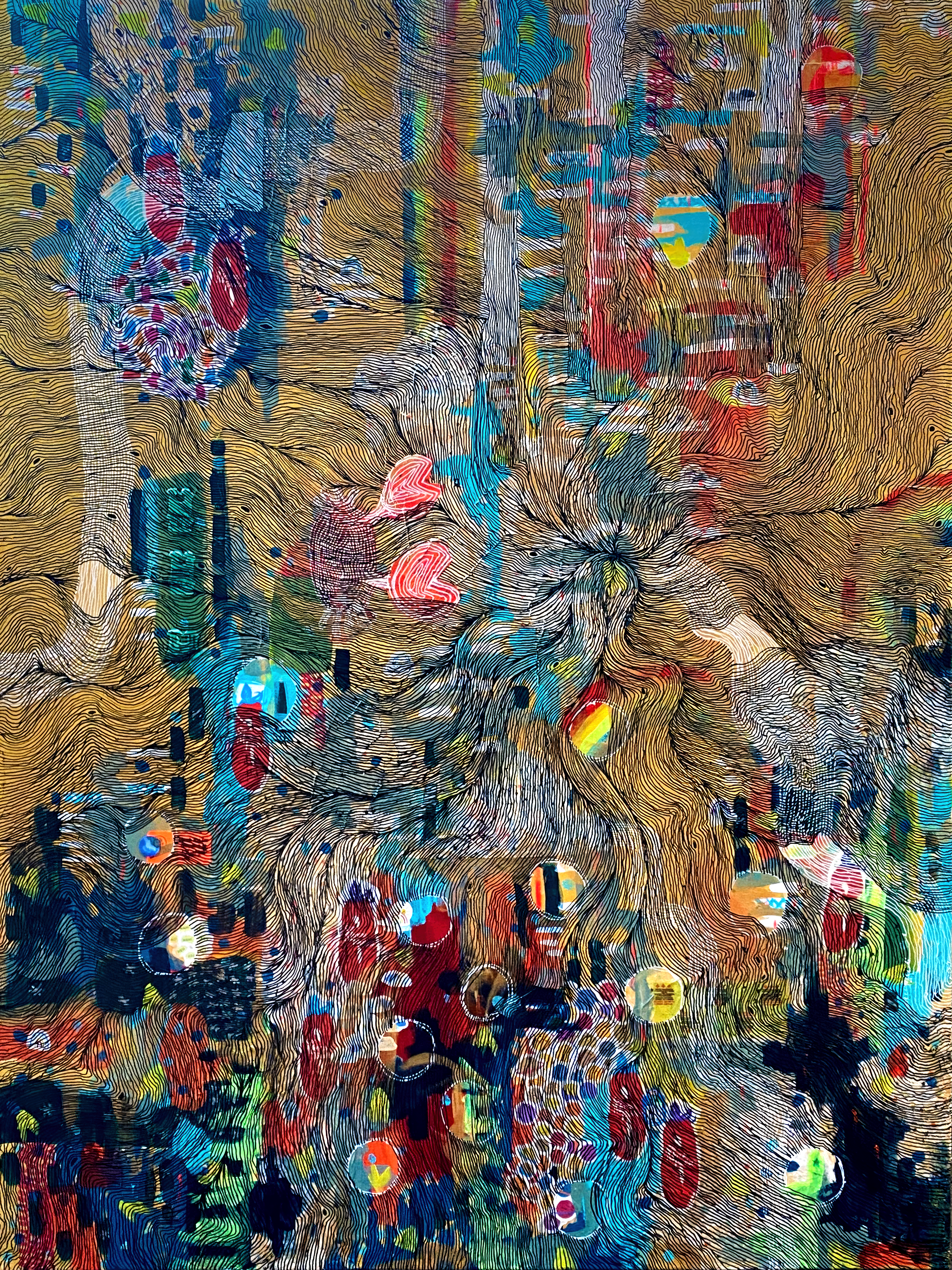 The painting’s surface shimmers with dimensional depth: textural collage pieces and reflective moments embedded into the canvas mirror the multiplicity of experience. It is at once microscopic and cosmic—an interior map of becoming, as well as a celestial field of potential.