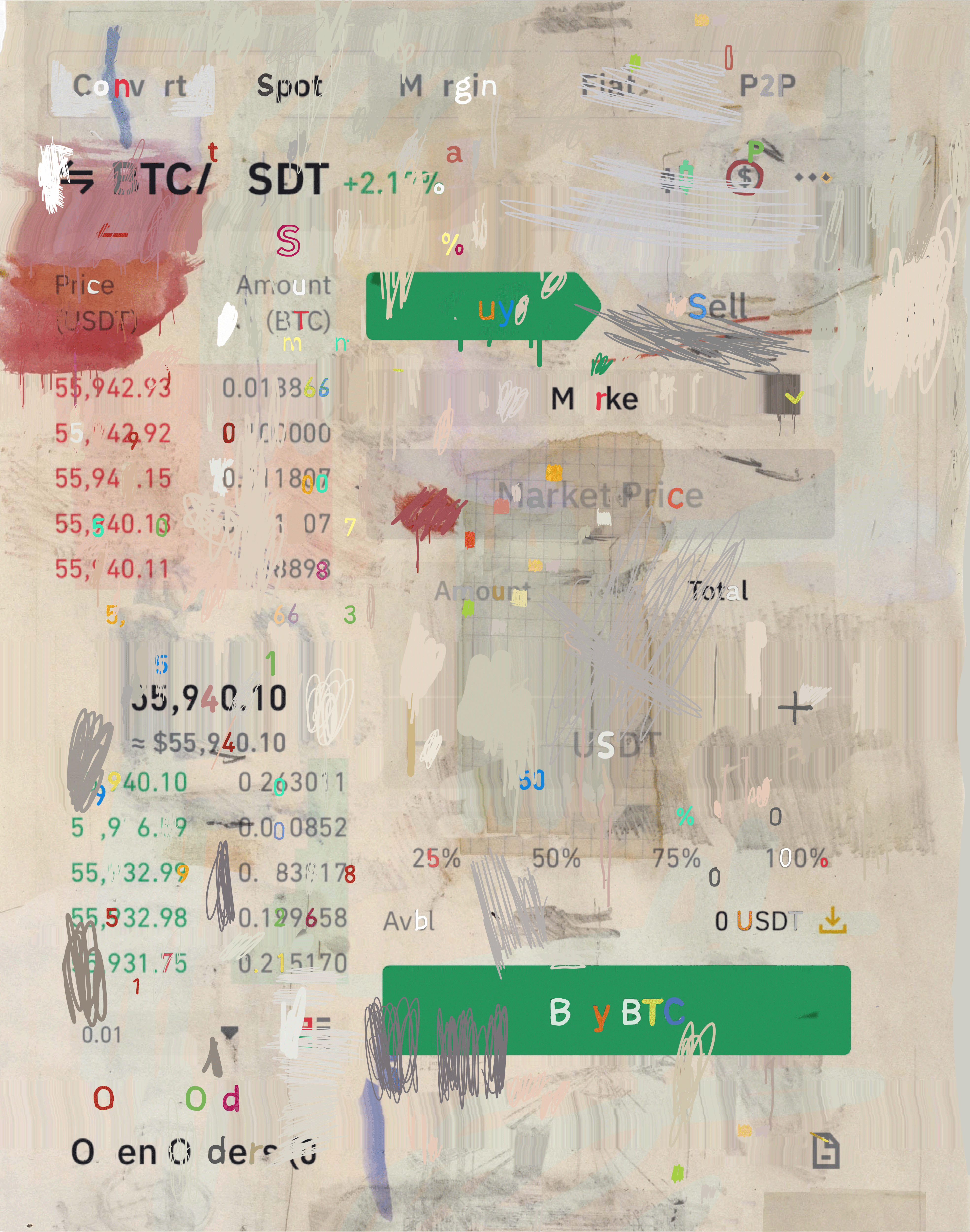Part of a screenshot series by Adrian Pocobelli celebrating iconic crypto user interfaces. This work is called BTC/USDT, which is based on a screenshot of the Bitcoin-Tether US dollar trading pair on the Binance cryptocurrency exchange. The work was composed on an iPhone X and mastered on a MacBook Pro. W: 3939 px H: 5000 px. Tools: Sketchbook Pro, Glitché, Photoshop. Collection: Screenshots - Crypto.