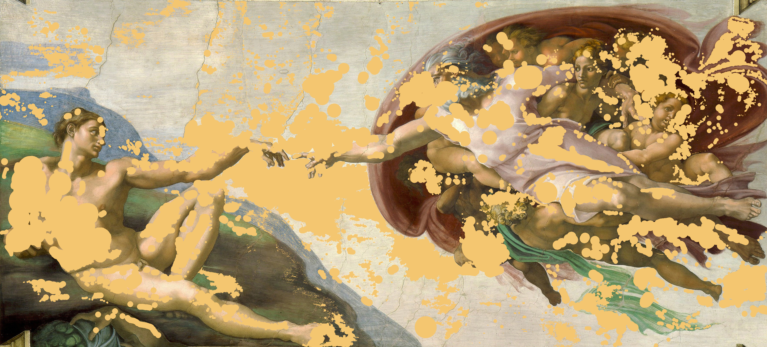 This is the tenth release (#10) from the Screen Memories collection. The series was started in 2017 and 'The Creation of Adam' was completed in 2022. Using an iPhone and a Macbook in combination, the series masks imagery in Renaissance paintings with screen-lit 21st-century shapes. W: 3264 px H: 1478 px. Size: 3,958,800 bytes. Format: JPG. Tools: Union, Photoshop. Collection: Screen Memories.