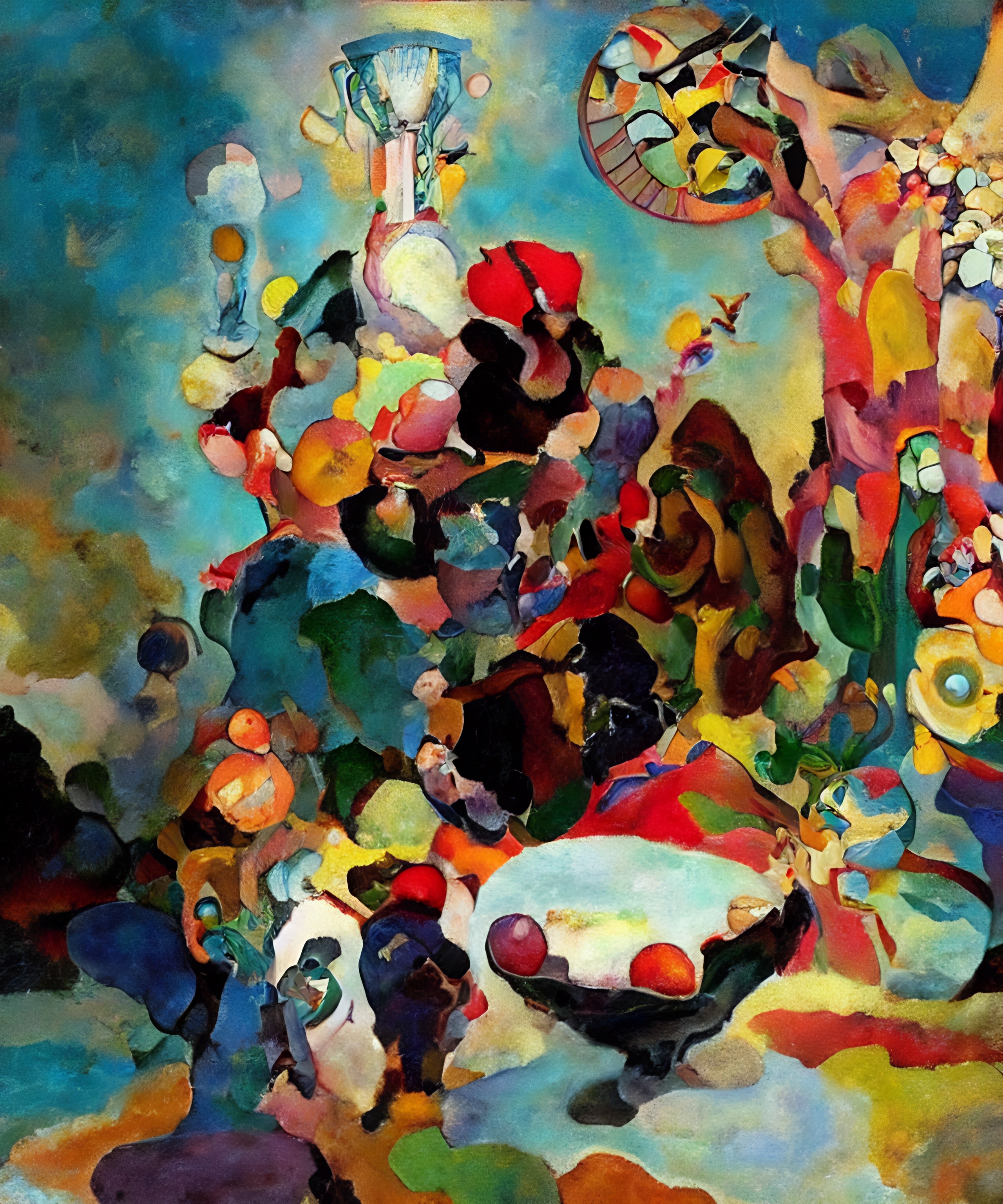 2025 April #012. The cosmic table presents itself as a realm where consumption and creation become indistinguishable. What began as an exploration of nutritive cycles evolved into something more profound—a visualization of how matter transforms across dimensional boundaries. My fascination with biological systems that mirror celestial patterns guided this composition. The turquoise atmosphere serves as a medium where gravitational anomalies suspend objects between states of being. These forms exist simultaneously as what they were and what they will become.