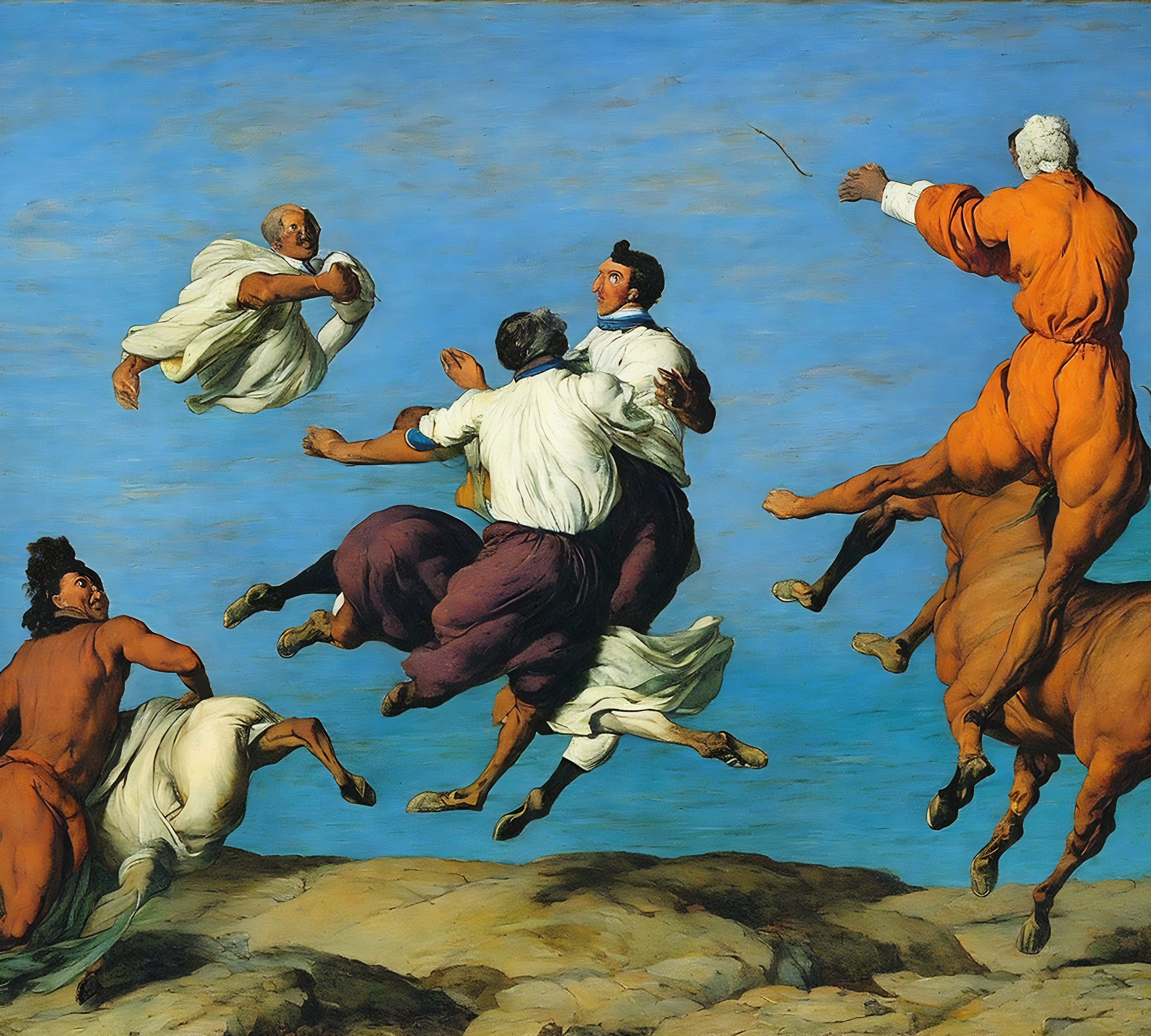 This magnificent tableau transforms human aspiration into visual poetry. The figures have shed earthly weight, becoming symbols of transcendent possibility as they soar above the narrow strip of rocky ground below. Their collective journey speaks to humanity's eternal quest for elevation—whether spiritual, artistic, or intellectual.